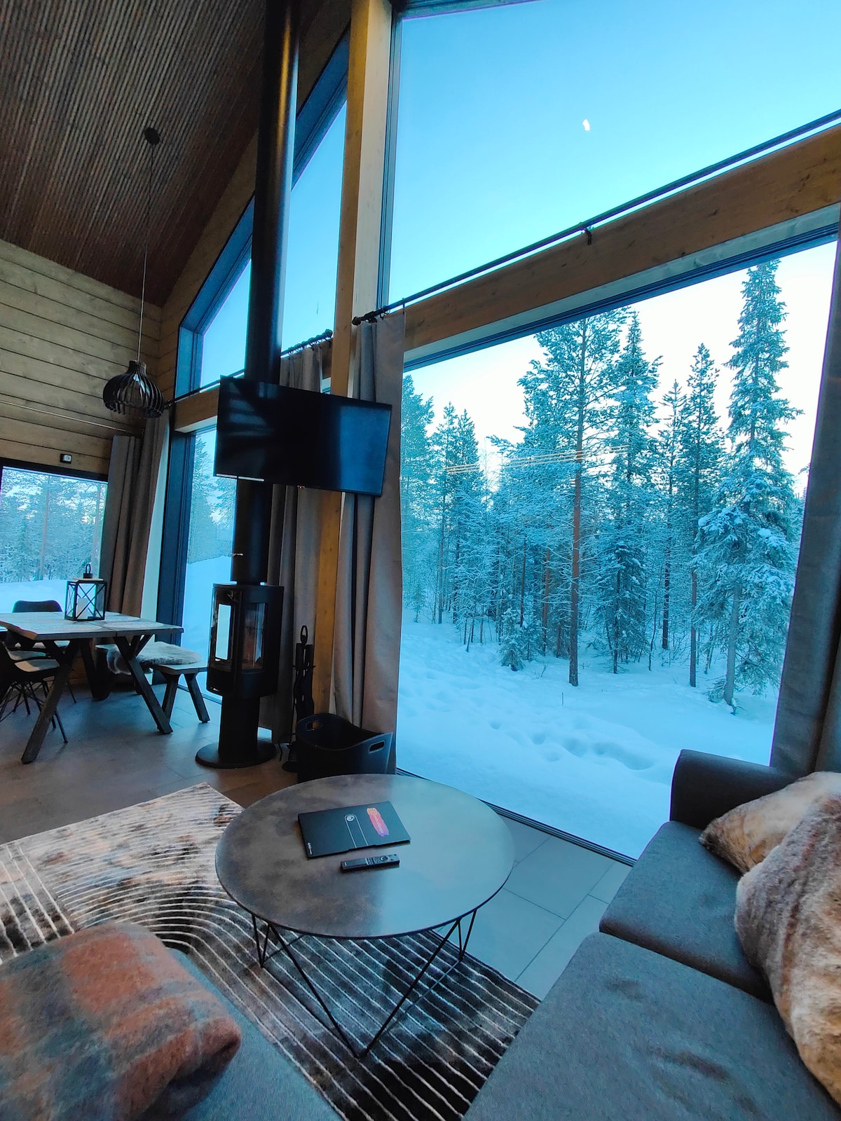 Iniimbitahan ka ng bagong binuksang komportableng cottage na mag-enjoy sa mahiwagang katahimikan ng Lapland, kung saan nagtatagpo ang katahimikan ng kalikasan ng Arctic at iba't ibang aktibidad. Ilang minuto lang ang layo ng mga ski trail, slope, at snowmobile trail at humihinto ang ski bus na humigit - kumulang 300 metro ang layo. Ang cottage ay may mainit na kapaligiran – mga ibabaw ng kahoy, fireplace, at sauna na lumilikha ng perpektong setting para sa pagrerelaks. Maligayang pagdating sa tunay na vibe ng Lapland – isang lugar kung saan bumabagal ang oras at malapit na ang kalikasan.
