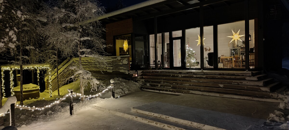 Maaari kang mag - enjoy at magrelaks sa natatanging destinasyong ito. Sa cottage na ito, may hot tub kung saan makikita mo ang kalangitan na puno ng mga bituin at mga ilaw sa Hilagang Silangan. Sa loob ng cottage, may orihinal na Finnish sauna. Piazza - Ylläs nationalpark mga 1 oras sa pamamagitan ng kotse, at ski resort 20min sa pamamagitan ng kotse. Malapit sa cottage na ito, maraming Natural na daanan at snowmobile na kalsada. Sa baybayin ng cottage , may tunay na Lapland Hut, kung saan maaari kang mag - camp fire. Mga tour ng Husky at reindeer 15min sa pamamagitan ng kotse Elves village 15min sa pamamagitan ng kotse