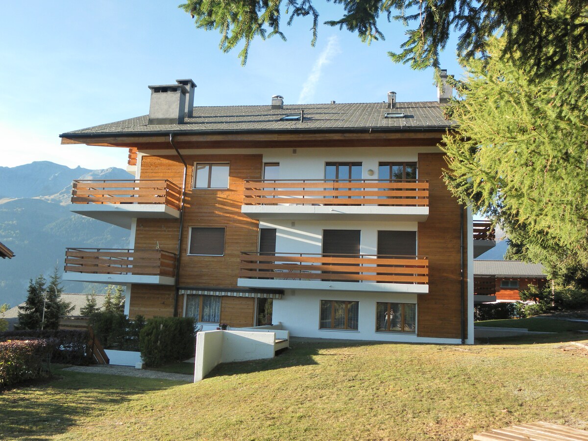 Magrelaks kasama ang buong pamilya sa mapayapang lugar na matutuluyan na ito. Nag - aalok ang 2 - bedroom chalet apartment ng mga nakakamanghang tanawin ng Alps. 10 minutong biyahe lang ang layo nito mula sa sentro ng Crans - Montana, na nag - aalok ng mga aktibidad sa buong taon. 8 minutong biyahe ang layo ng Barzettes ski lift. 5 minutong lakad lang ang layo ng maraming hike mula sa apartment. Binubuo ang apartment ng 2 silid - tulugan, isang sala na may bukas na kusina. Mayroon itong lahat ng amenidad para sa isang nakakarelaks na katapusan ng linggo o mas mahabang bakasyon ng pamilya sa taglamig o tag - init.