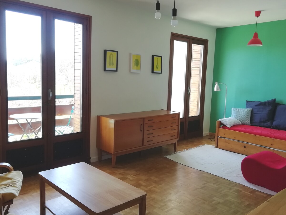 Apartment (37m²) + terrace na may sofa (7m2) na matatagpuan sa unang palapag ng villa /independiyenteng pasukan/timog na nakaharap / malapit sa sentro ng lungsod. Kumpletong kusina, silid - tulugan na pinaghihiwalay ng canopy / parking space sa harap ng unit. Amazon Prime smart TV. Malapit: mga supermarket (Lidl Auchan) - panaderya - parmasya - swimming pool na may hammam sauna - libreng parke ng bus sa lungsod. Tamang - tama para sa 2 may sapat na gulang, business traveler, biker May mga linen / tuwalya.