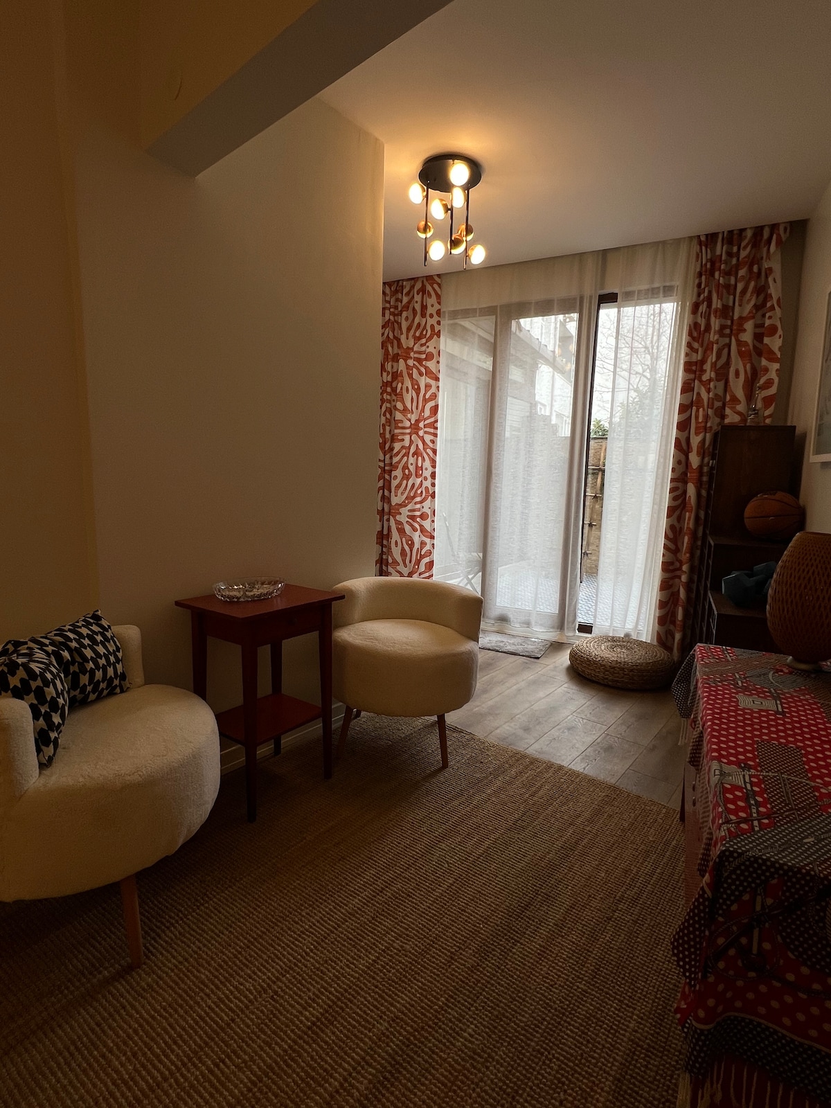 Cozy and stylish flat in Balat with Golden Horn views. The living room features a comfortable sofa, vibrant Turkic pillow cases, and handwoven rugs that add warmth and cultural charm. A smart TV, dining area, and fully equipped kitchen with modern appliances ensure convenience. The bedroom offers a restful bed with fresh linens and storage space, while the flat’s authentic details create a home-like atmosphere. Perfect for exploring Balat and nearby Galata Tower, Hagia Sophia and the Blue Mosque