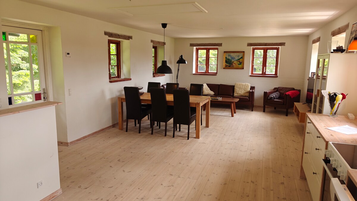Malaki at maluwag, well - equipped holiday apartment, na angkop para sa mga pamilya na may mga anak, ng isang kabuuang tungkol sa 90 m2. 65" smart tv. Kasama sa property ang isang malaking lagay ng lupa na may maginhawang landas sa paglalakad at isang patlang na may posibilidad na tumakbo, pagsasanay ng aso at sa pamamagitan ng kasunduan: kotse, bisikleta at motocross, pagsakay sa kabayo, atbp. Sa pamamagitan ng pag - aayos at bayarin, puwede kang mag - organisa ng mas maliliit na party/event para sa hanggang 40 bisita at sa kabuuan, puwede akong mag - alok ng matutuluyan para sa humigit - kumulang 15 bisita.