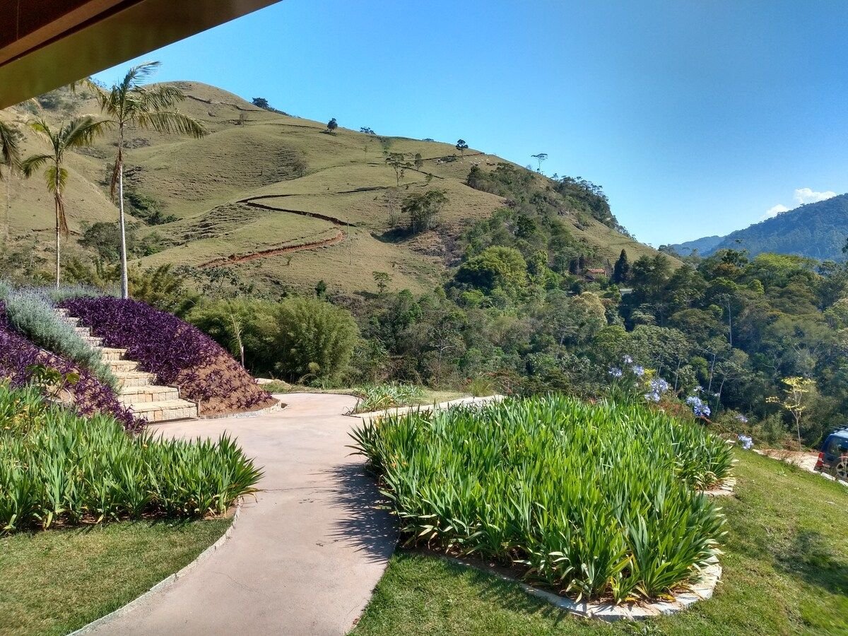 Venha desfrutar da privacidade, conforto e aconchego que o Terras Altas oferece! A 5km de São Pedro da Serra/Nova Friburgo, oferecemos hospedagem em chalés de madeira, com jardim projetado pela Burle Marx Paisagismo e uma vista de tirar o fôlego. - Banheira com hidromassagem - O chalé tem cooktop, panelas, utensílios de cozinha, cafeteira, forno elétrico, pó de café, açúcar, adoçante, frigobar, pratos, talheres, etc. Não servimos café da manhã. - Check-in das 14h às 20h e check-out até 12h