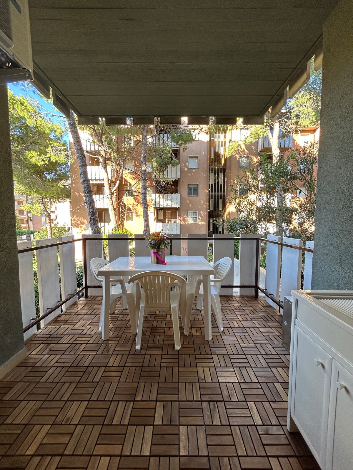 Prestihiyosong apartment sa ika -1 palapag na may elevator, isang bato mula sa dagat. Daanan ng bisikleta sa harap ng bahay para marating ang tabing - dagat ng Silvi, Montesilvano at Pescara. Binubuo ng malaking double bed sa kuwarto na 210cm, single bed na maaaring buksan, air conditioning, at Smart TV. Sala na may malaking double sofa bed (h18cm ang kutson), smart TV, kumpletong kusina, at air conditioning; komportableng banyo na may maluwag at maliwanag na shower. Magandang terrace na may dining table. Walang alagang hayop