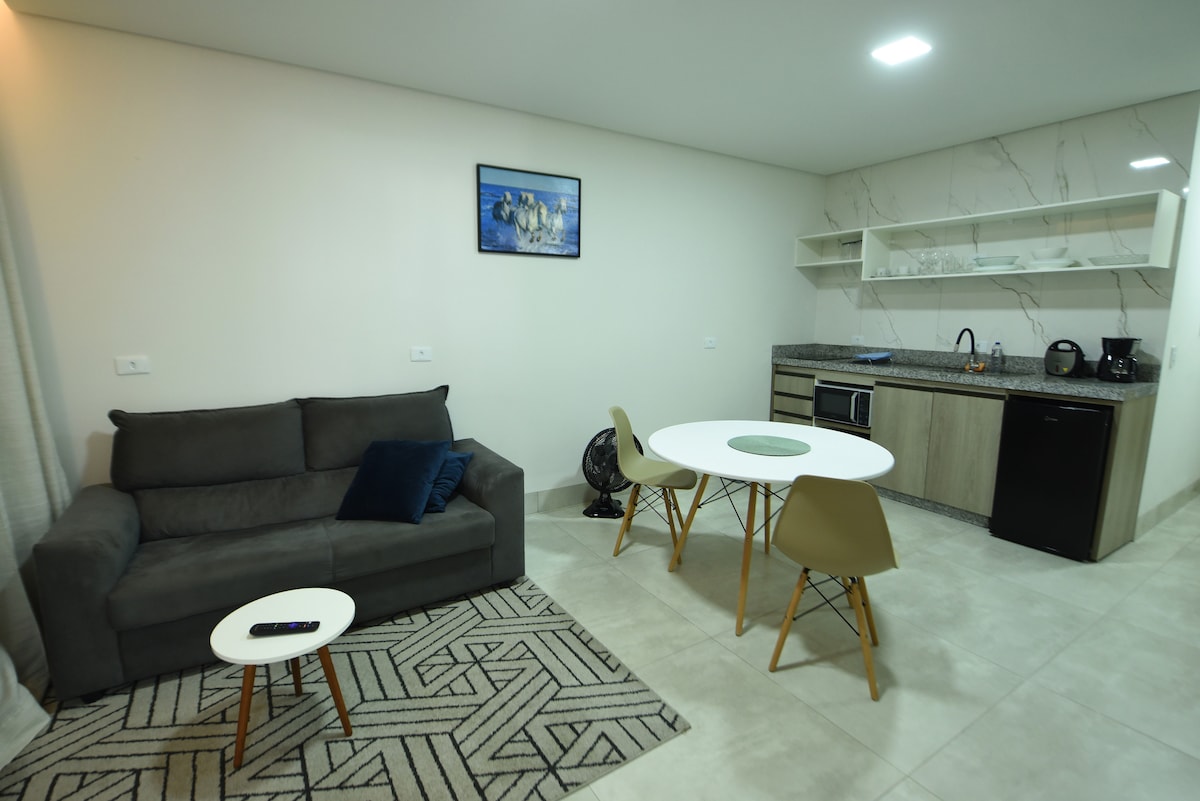 Apartamento com cama de casal, ambiente limpo e seguro, com quarto que possui lençóis de ótima qualidade, cobertores macios, cozinha com área de alimentação e trabalho, com louças disponíveis, microondas, chaleira elétrica, frigobar e de brinde pó de café para o preparo de seu cafezinho e no banheiro tem sabonete líquido, shampoo e toalhas branquinhas.