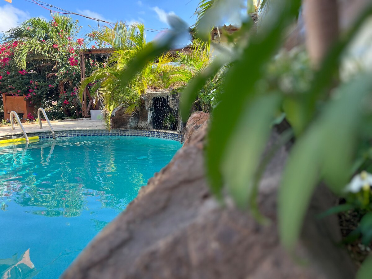 A thoughtfully designed space, crafted to offer a unique setting where you can unwind and enjoy your stay in Curaçao. Fully booked? Check our Airbnb profile (click our picture) for 1 more beautiful space nearby. Here's a sneak peek of our fantastic offering: ✔ Stunning loft hammock floor hanging net ✔ Air Conditioning ✔ 1 Comfortable BR. ✔ Fully Equipped Outdoor Kitchen ✔ Pvt Tiny pool ✔ O/DR shower ✔ Fast Wi-Fi ✔ Free Parking ✔ Five minutes from Jan Thiel / Papagayo Beach Learn more below!