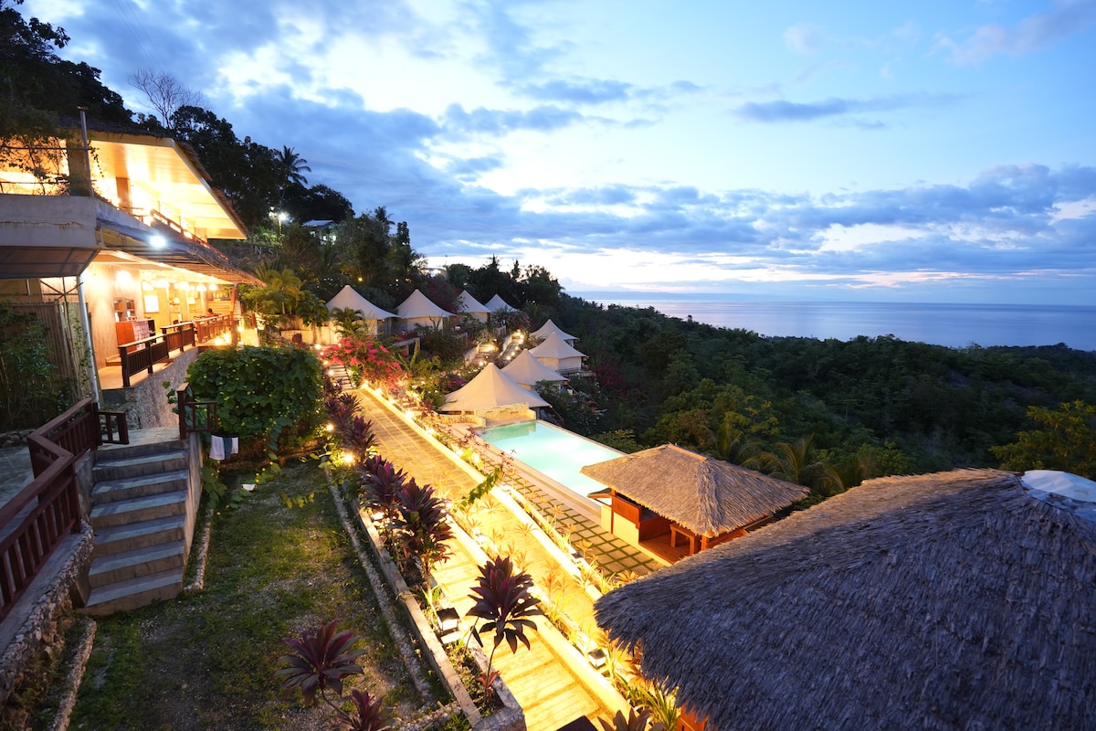 We are not on the beach or the main road. Paliton Beach is about 5 minutes away, and Siquijor Port is around 15 minutes by scooter or car, and parking is available. A bright second-floor room with a beautiful combined view of the tropical garden and the natural swimming pool. Features a 1.8 × 2.0m King bed. Guests enjoy Starlink Wi-Fi, reliable solar-powered electricity, and access to our naturally filtered 90㎡ swimming pool.