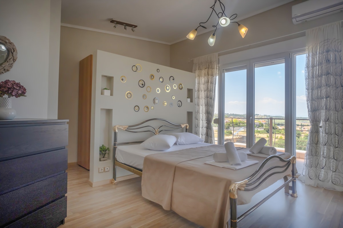 Matatagpuan sa tuktok ng burol kung saan matatanaw ang nayon ng Kassaandreia, makikita mo ang maluwang na Sunrise Villa. Sa 2500 sqms ng pribadong hardin na may security gate, ang villa ay may privacy ngunit lokal din sa mga tindahan, supermarket at lokal na nightlife. 5km lang ang layo mula sa mga asul na flagged beach ng Siviri at Kalithea at 2km mula sa Lidl. Ang bahay ay may malaking open plan lounge, kusina at dining area na may mga bukas na hagdan papunta sa iba pang palapag. May AC ang mga kuwarto maliban sa gym. Lahat ng kuwartong may mga lambat ng lamok. Mga alagang hayop kapag hiniling