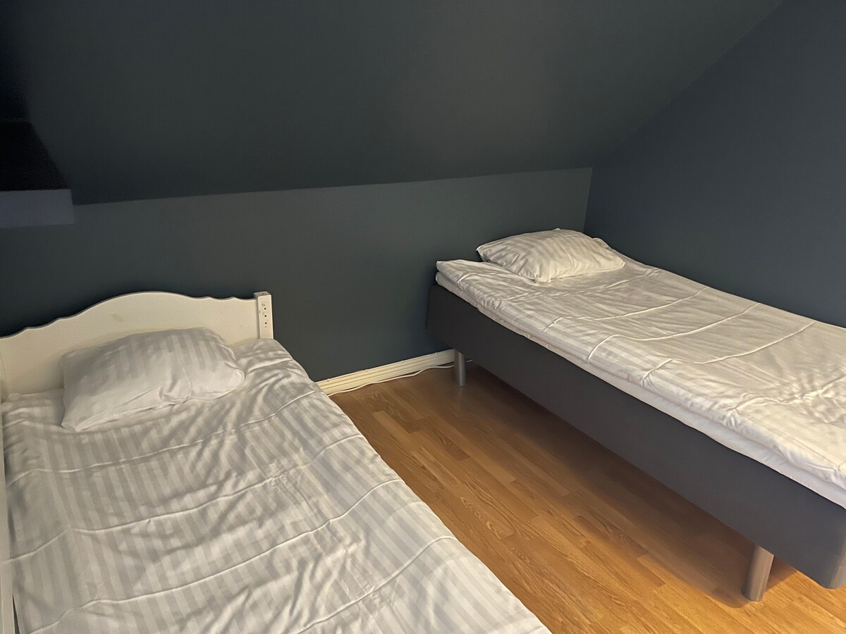 Kumpleto sa gamit na loft. May mas malaking sala na may rooftop na basura sa hilaga at timog. Buksan ang plano sa sahig na nakasaad sa mga litrato. Sariwang shower/toilet. Kusina na may oven at induction stove. Isang maliit na pulang cast iron stove kung gusto mong mag - snuggle up pagkatapos ng magandang pagkahulog o paglalakad sa taglamig. Double bed (dalawang nakatiklop na 90 kama) sa sala. Mayroon ding mas maliit na 90 - bed sa isang nook. Sa kuwarto ay may 120 - at 90 - bed. Available din ang kuna. 300 metro ang layo ng bus stop. Mga kamangha - manghang daanan sa paglalakad!