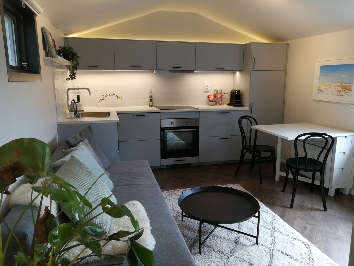 Bagong na - renovate (2020) magandang guesthouse na 45 sqm para sa 5 taong malapit sa beach, sentro ng lungsod at mga restawran. Ang guesthouse ay may hiwalay na silid - tulugan na may 180cm double bed, sa sala ay may sofa bed (140cm) at dagdag na kama. Kumpletong kusina at banyo na may shower. Available ang travel cot at mga bisikleta. Ang cottage ay may pribadong patyo na may lounge group at dining table, pati na rin ang access sa libreng paradahan na may pagsingil para sa de - kuryenteng kotse. Maligayang Pagdating!