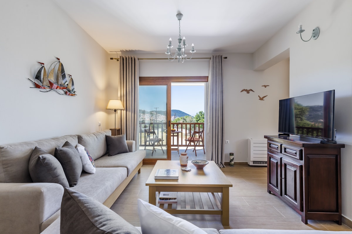 Malapit sa lahat ang espesyal na lugar na ito, na ginagawang madali ang pagpaplano ng iyong biyahe. Napakaluwag ng apartment at komportableng makakapag - host ng 4 na tao. Mayroon itong 2 silid - tulugan na may double bed. Sa harap ng apartment ay may malaking kusina at sala na nilagyan ng mesa ng kainan, sulok na sofa, fireplace, TV at tanawin ng Skopelos.