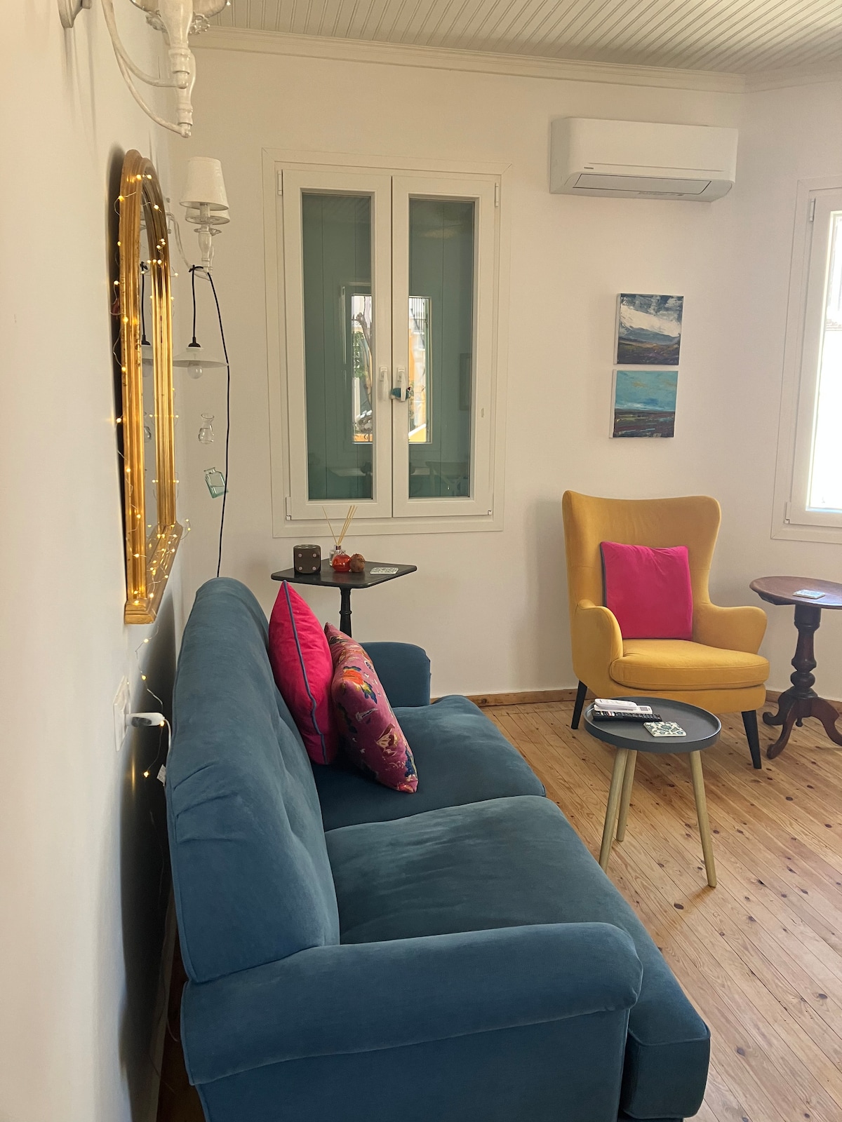 Masiyahan sa maaliwalas, seaview, at sea breeze na lokasyon na ito. Sa isang kuwentong tuluyan sa Greece. Gamit ang iyong sariling pribadong kambal na 90 cm ang lapad na higaan. 5 minuto lang ang layo mula sa burol/ hagdan papunta sa bayan at sa harap ng dagat. Overhead fan, A/C unit at USB socket. May nakakandadong pinto ng kuwarto. Pinaghahatiang banyo sa shower. Pinaghahatiang lugar sa kusina para sa mainit at malamig na refreshment. light breakfast. USB + WiFi. Maraming lokal na kaalaman at paglalakad na ibabahagi. Imbakan para sa mga bisikleta at paggamit ng beach parasol.