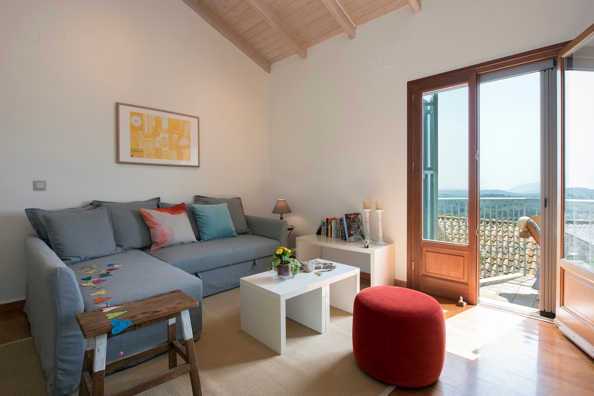 Ang pagiging tunay ng nakapaligid na kapaligiran at ng bahay, 200 taong gulang na gusaling bato, ay nagbigay - inspirasyon sa amin na lumikha ng isang maganda at gumaganang espasyo, na puno ng liwanag, mga kulay at pag - awit ng mga ibon, na nag - iiwan mula sa bukas na mga pintuan ng balkonahe para dumaan. Ang mga kamangha - manghang tanawin mula sa patyo at hardin, sa Dagat at sa mga berdeng burol, magpagaling at kalmado. Pagalingin at kalmado para sa mga bisita na naghahanap ng tunay na bahagi ng isla. Malapit sa bundok, mga beach, (10 minuto ang layo sa pamamagitan ng kotse), bayan ng Corfu (25 min
