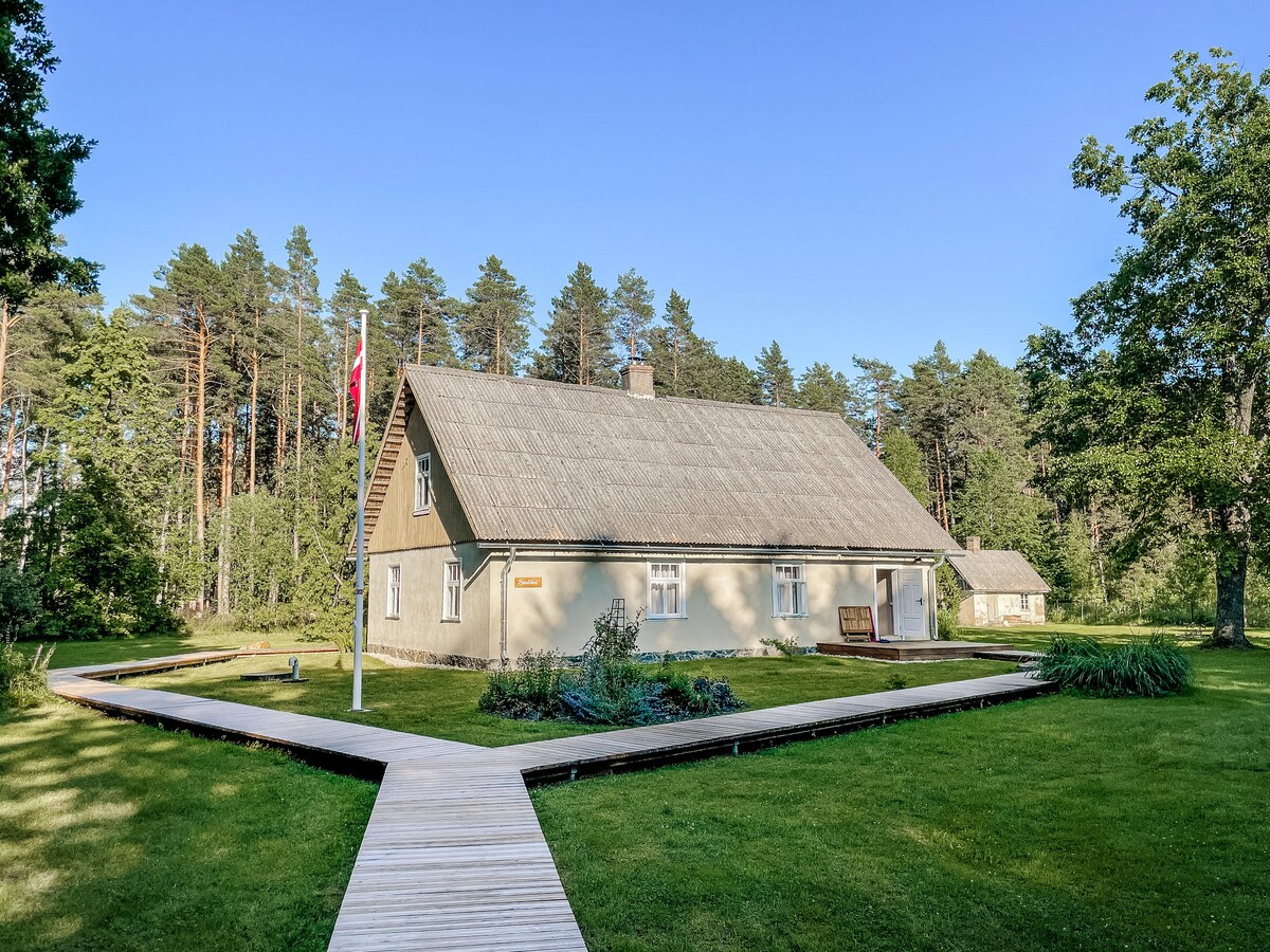 Ang aming maginhawang kahoy na bahay ay angkop para sa 4 na tao (o pamilya 2+ 3). Matatagpuan ~ 450m mula sa dagat, sa gilid ng berdeng kagubatan at parang. Ito ay ~50 sqm cottage at isang malaking outdoor terrace ang ibinibigay para sa mga bisita. Mayroon ding lawa at bahay - bahayan ng mga bata sa lugar. Ang bahay ay may 2 palapag: sa ika -1 palapag ay may studio - type na sala, na sinamahan ng sulok ng kusina at banyo. Sa ika -2 palapag ay may 1 pandalawahang kama at 2 pang - isahang kama. Libreng paradahan.