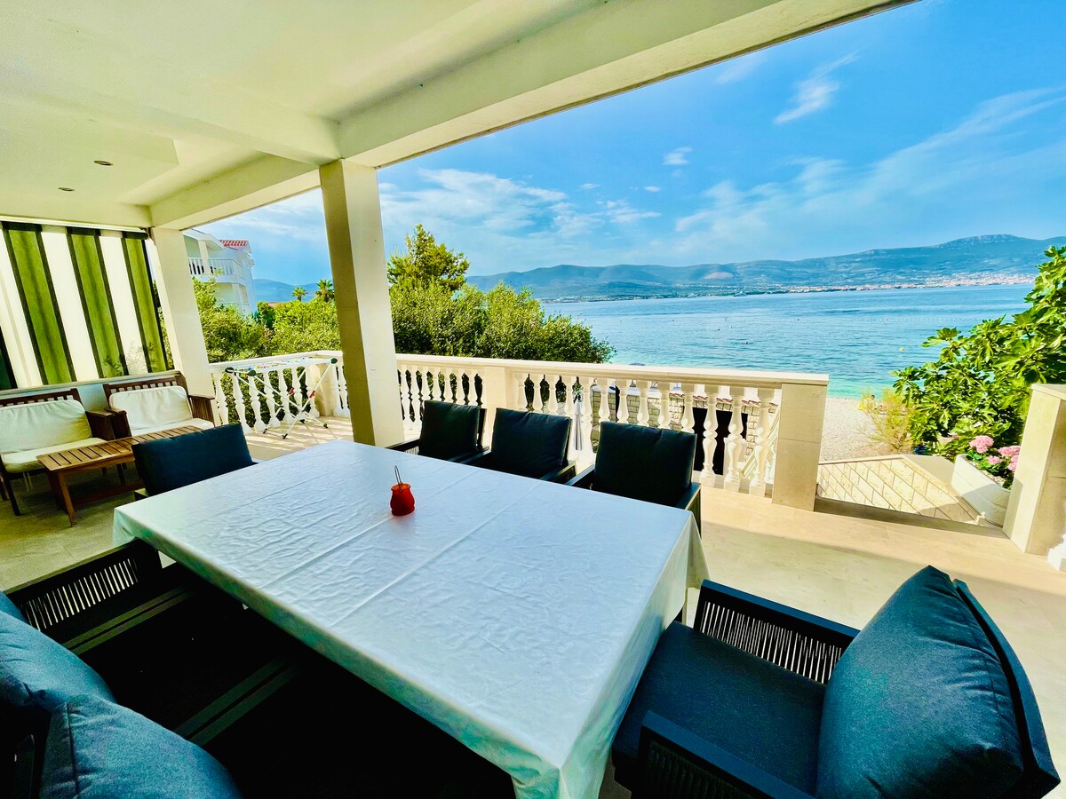 Magandang Beachfront House Opsyonal na 2 o 3 king size na silid - tulugan (Ang presyo ng listahan ay 2 silid - tulugan lamang at maximum na 4 na bisitang may sapat na gulang at 1 batang wala pang 12 taong gulang) Para sa 1 o 3 silid - tulugan na opsyon, magpadala sa amin ng mensahe para sa presyo. Kapasidad para sa 7 bisita (6 na may sapat na gulang at 1 batang wala pang 12 taong gulang) Sa opsyonal na 3rd King size suite na may dagdag na bayarin. 180 degree na tanawin ng karagatan! Pribadong lokasyon, beach front. Malapit sa Trogir at Split. Magrelaks sa ilalim ng lilim ng 100 taong gulang na mga puno sa malaking hardin. 15 minutong biyahe mula sa paliparan Hanapin kami sa IG : sundaybeachhouse