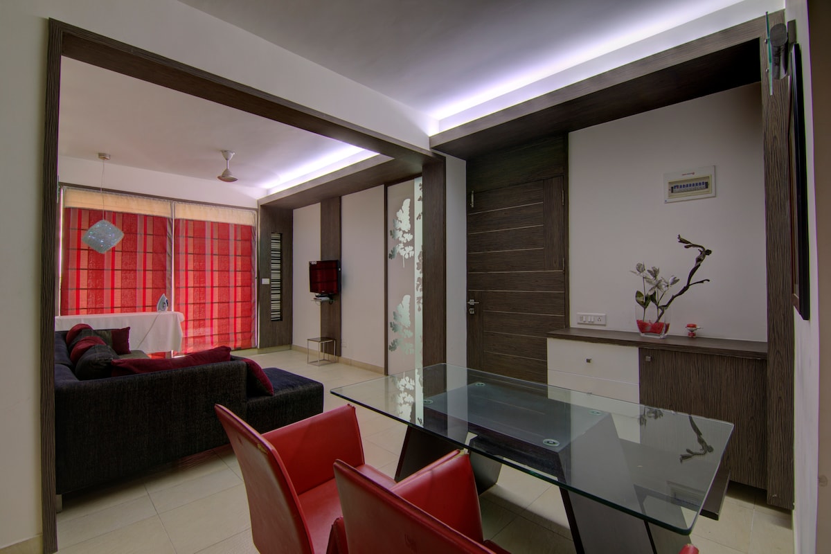 Maligayang pagdating sa aming bago at premium na 1 - Bhk apartment, na perpekto para sa mga mag - asawa at biyahero na naghahanap ng kaginhawaan at privacy sa isang mahusay na sentral na lokasyon. Ang silid - tulugan ay may queen bed na may malambot na orthopedic mattress para sa tahimik na pagtulog sa gabi. Magrelaks sa komportableng sala na may Smart TV, mabilis na WiFi at bukas na kusina. May kasamang napakalinis na banyo na puno ng mga pangunahing kailangan sa paliguan. Kasama sa kumpletong kusina ang mga de - kalidad na kasangkapan at crockery para sa iyong mga paglalakbay sa pagluluto!