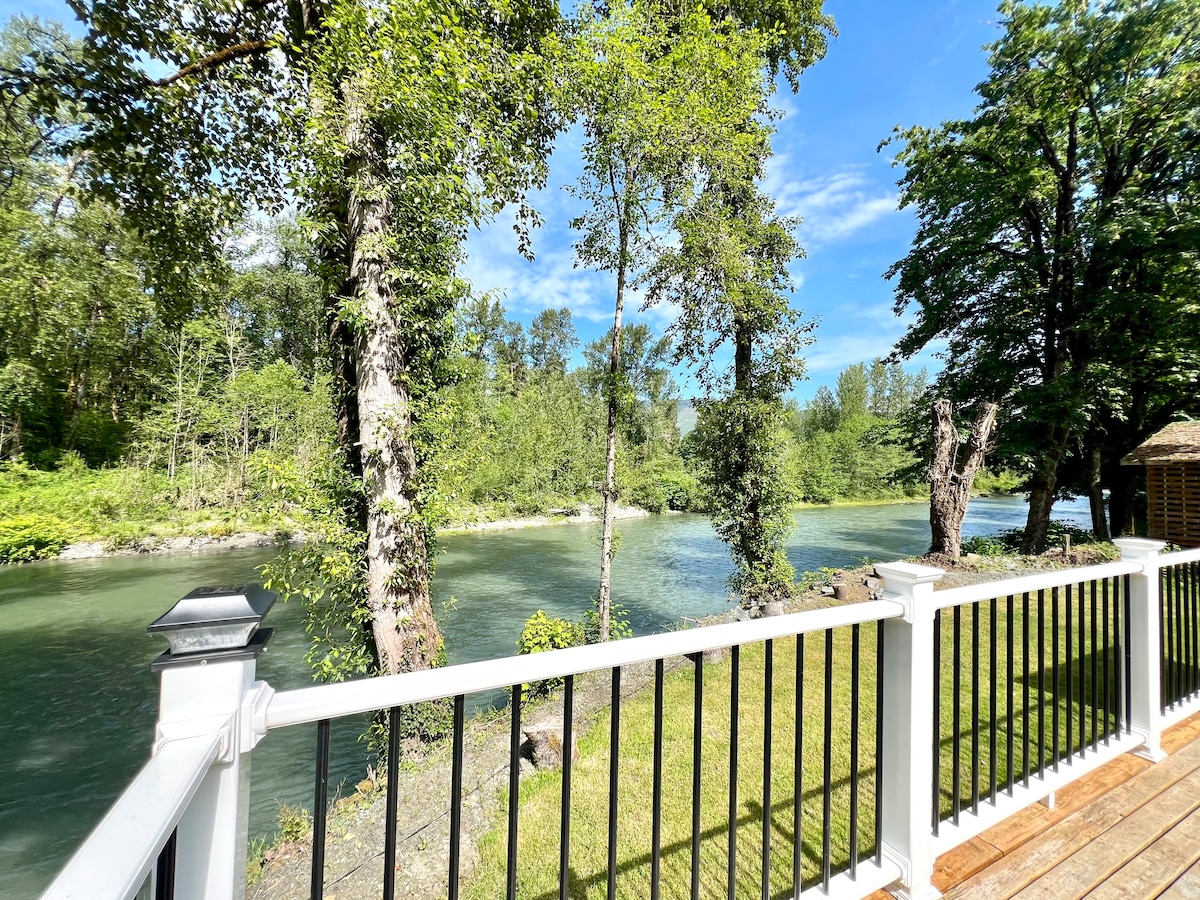 Immerse yourself into the pacific northwest’s beauty at this beautiful home in a very unique location right next to the river, wake up to birds chirping and watch the eagles soar. The home is spacious and comfortable for a close getaway from the city, for you, friends and family. Kitchen is well equipped for meals. Spacious deck with dining and seating area for gathering and fire pit table. Large grass backyard with fire pit for playing games, gathering around the fire and roasting marshmallow