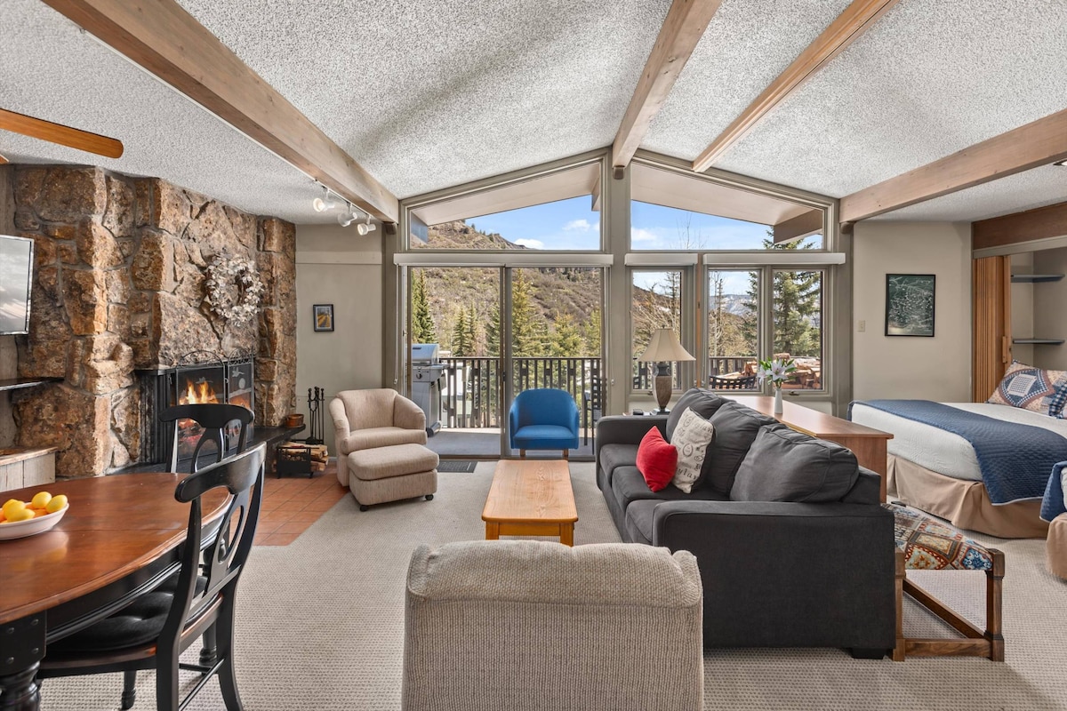 Naka - istilong MALAKING studio condo. Bagong ayos. Corner unit. Matatagpuan sa central Core ng downtown Aspen sa isang tahimik at magandang kapitbahayan na may nakaharap na tanawin ng Smuggler Mountain. Naglalakad ang malalaking sliding glass door papunta sa maluwag na patyo at berdeng espasyo. Sa kabila ng kalye ay ang Roaring Fork River, hiking path at tulay. 2 bloke sa lahat ng shopping, restaurant, nightlife, skiing, hiking at pagbibisikleta. Ang Gondola ay 6 na bloke ang layo, Wood Burning Fireplace, LIBRENG Parking, Washer/Dryer, Ski Locker.