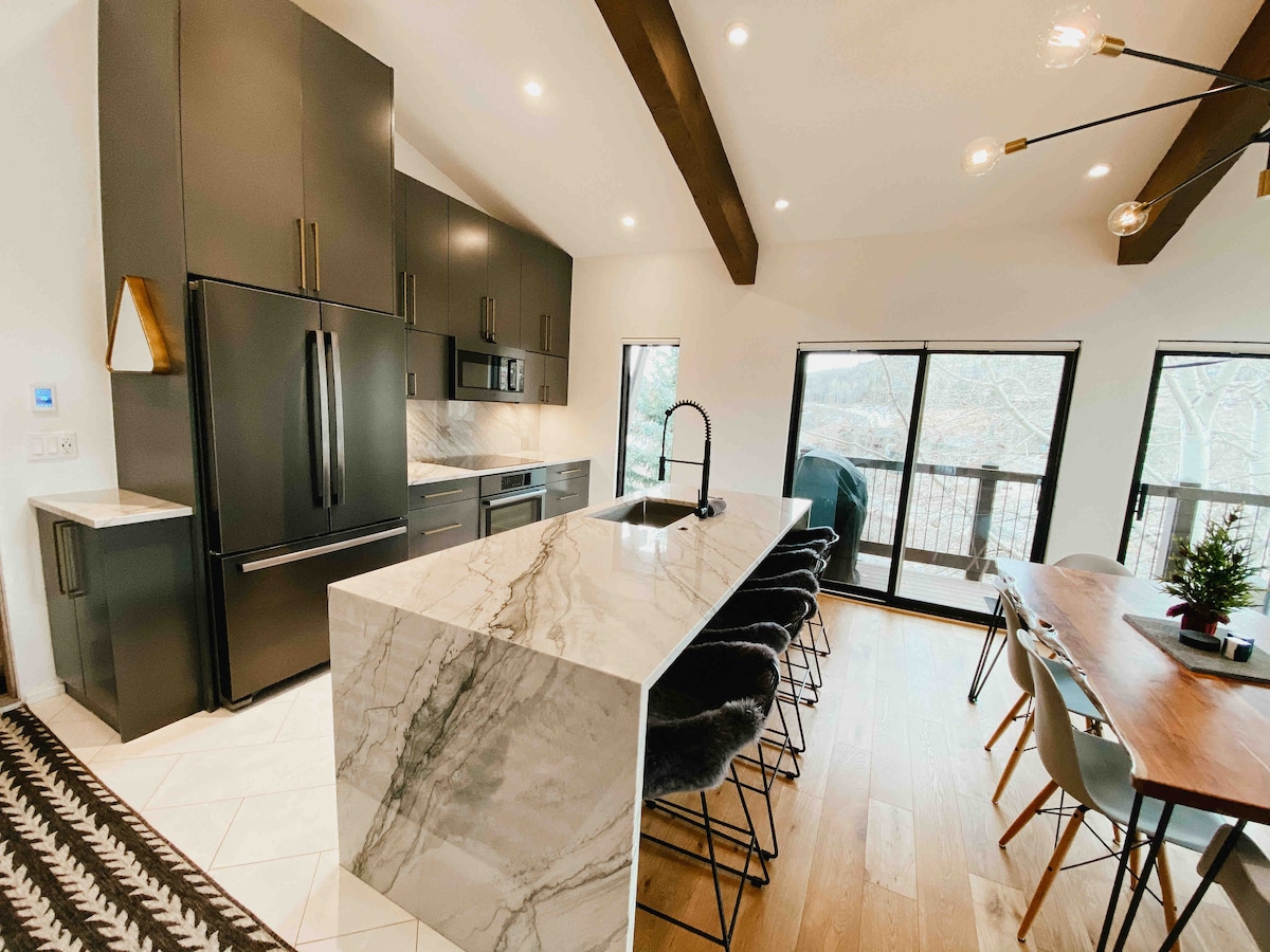 Make this beautiful Snowmass Village condo your adventure hub or relax comfortably. Enjoy biking / hiking rim trail from the complex or short shuttle ride to the ski slopes (can also ski across bridge). 20 min from Aspen. Brand new renovation. 3 smart TVs. New furniture and bedding. Washer / Dryer, private deck with grill Pool, large hot tub, sauna, town shuttle, bus route, free parking, ONE DOG per rental, unbelievable views