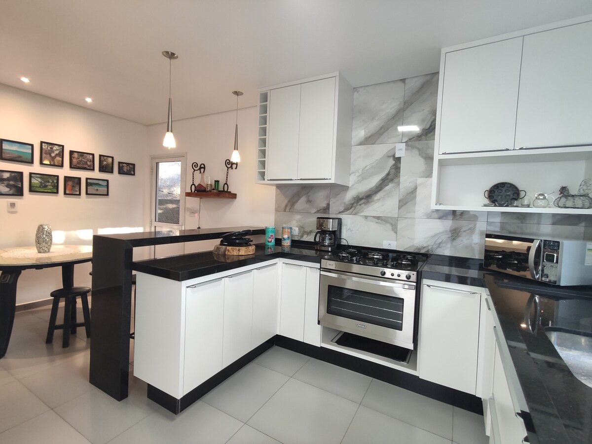 Eksklusibong bahay na may mga nakakamanghang tanawin, barbecue, 3 suite na may balkonahe na nakaharap sa pool, ang pangunahing may bathtub, queen bed at air conditioning. Ang bahay ay may Wi - Fi, sariling pag - check in, mga speaker, sala na may fireplace at smart TV. Matatagpuan sa tuktok ng bundok na may makalangit na tanawin. Isang ligtas na lugar, na napapalibutan ng screen, sustainable, 100% ng kuryente na ginawa dito at awtomatikong gate. Puwedeng maglakad - lakad ang iyong alagang hayop sa buong property (2000 m2).