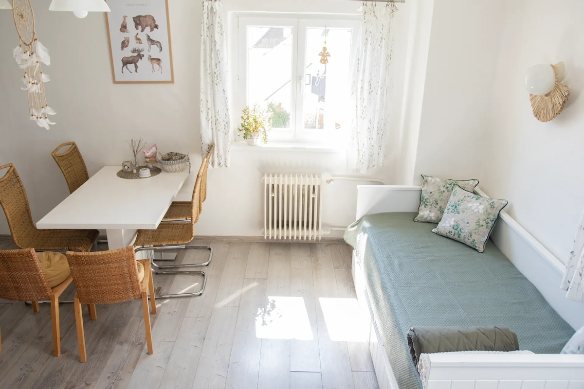 Modernong maliwanag na studio sa gitna ng Karlovy Vary, perpekto para sa mag‑asawa o mag‑isang bisita. Nasa ika‑4 na palapag ng makasaysayang bahay ang tuluyan at walang elevator. May modernong banyo na may shower, double bed, kusinang may kumpletong kagamitan para sa paghahanda ng almusal o mga pampalipas‑gutom, at modernong interior na malinis ang estilo. Maliit man ang studio, idinisenyo ito nang praktikal. Ang lahat ng mahalaga ay nasa maigsing distansya. Magandang opsyon para sa mga bisitang gustong talagang maranasan ang Karlovy Vary, hindi lang basta "bisitahin" ito.
