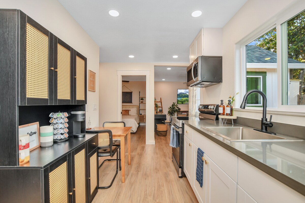 Private Studio Cottage with open floor plan and European country decor 1 large bath with TUB SHOWER COMBO Large kitchen with a large assortment of dishes, utensils... Private yard with BBQ, chairs, dinning, hammock Easy walking to SHOPS AND CAFES Supper quiet and private. We do take extra care to provide comfort, cleanliness, and convenience at the property. Just the way I would like if I was a Guest!! We also have another cottage on the property that sleeps 2, called Cozy Carriage House.