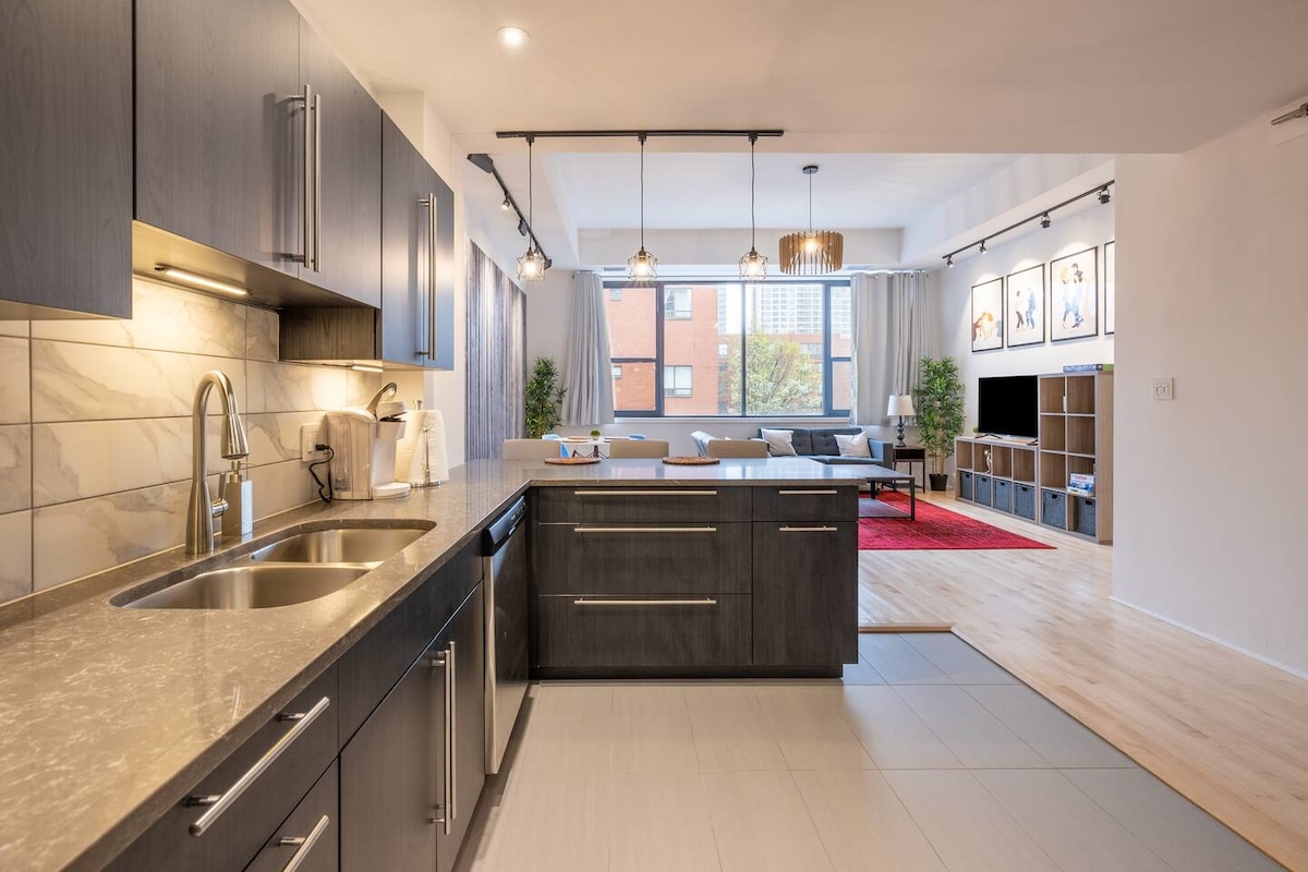 Maligayang pagdating sa iyong perpektong bakasyon! Ang kamangha - manghang 2 - bedroom na tuluyan na ito ay ang simbolo ng modernong chic; na nag - aalok ng hindi malilimutang timpla ng estilo at kaginhawaan. Idinisenyo para sa hanggang 6 na bisita, ang tuluyan ay ginawa na may mga pinag - isipang detalye ng arkitektura at mata para sa eclectic na dekorasyon. Matatagpuan sa gitna ng Pilsen, na kilala sa masiglang tanawin ng sining, mga naka - istilong restawran, at lokal na kultura, magiging perpekto ka para i - explore ang lahat ng iniaalok ng Chicago.