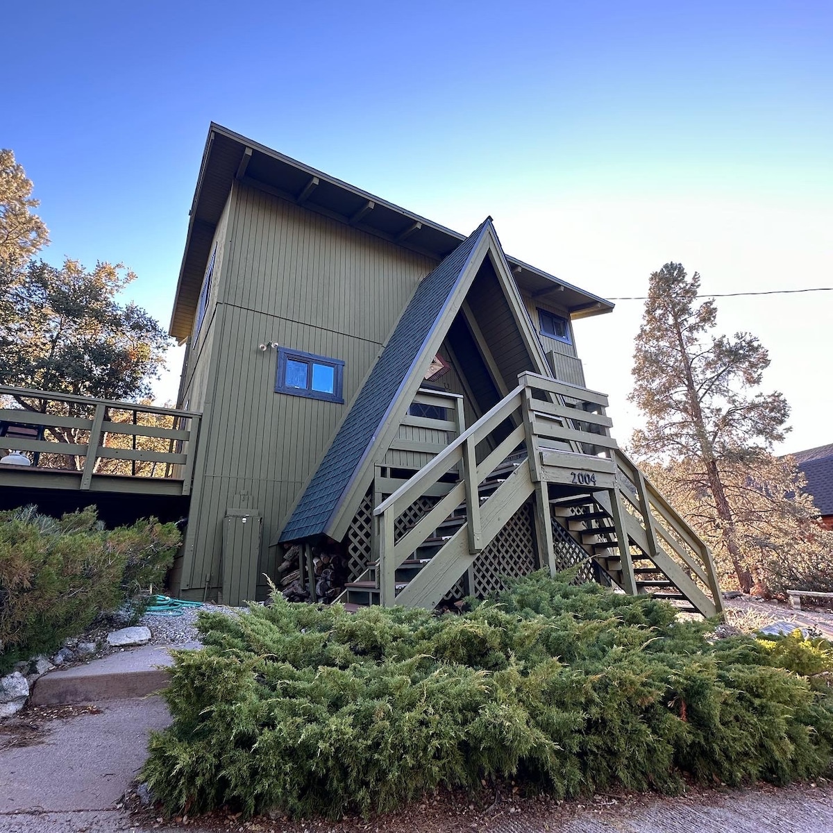 Ang aming maganda at mala - probinsyang A - Frame cabin ay ang eksaktong naiisip mo kapag nangangarap kang magbakasyon sa bundok. Ang cabin ay matatagpuan sa gitna ng mga pine tree na may dalawang malalaking deck. Sa loob, masisiyahan ka sa pagrerelaks sa family room na may mga kahoy na may mga vaulted na kisame at mga tanawin ng kagubatan mula sa sahig hanggang sa mga bintana sa kisame. Maaari mong isipin ang pag - upo sa harap ng isang umuugong na apoy sa open style na fireplace ng kahoy sa mga gabi ng taglamig at nasisiyahan sa oras sa deck na nakikinig lamang sa mga tunog ng kagubatan.