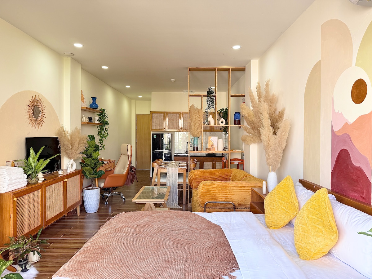 Ang Apartment: • 1 Higaan | 1 Banyo | 2 Bintana • An Hai Bac, Son Tra, Da Nang • Panandalian | Pangmatagalan Ang Gusali: • 6 na palapag • 5 minutong access sa My Khe Beach • 7 min access sa Da Nang center • Hardin sa Ground floor • Pool sa Rooftop Bilang isang apartment na may natatanging disenyo sa lahat, mayroon itong magandang layout, disenyo ng kulay ng popup, na angkop para sa iyo na naglalakbay nang mag - isa, mag - asawa, o pares ng mga kaibigan. — MGA ESPASYO SA TUK TAK Ang 't na - - - -, ♡
