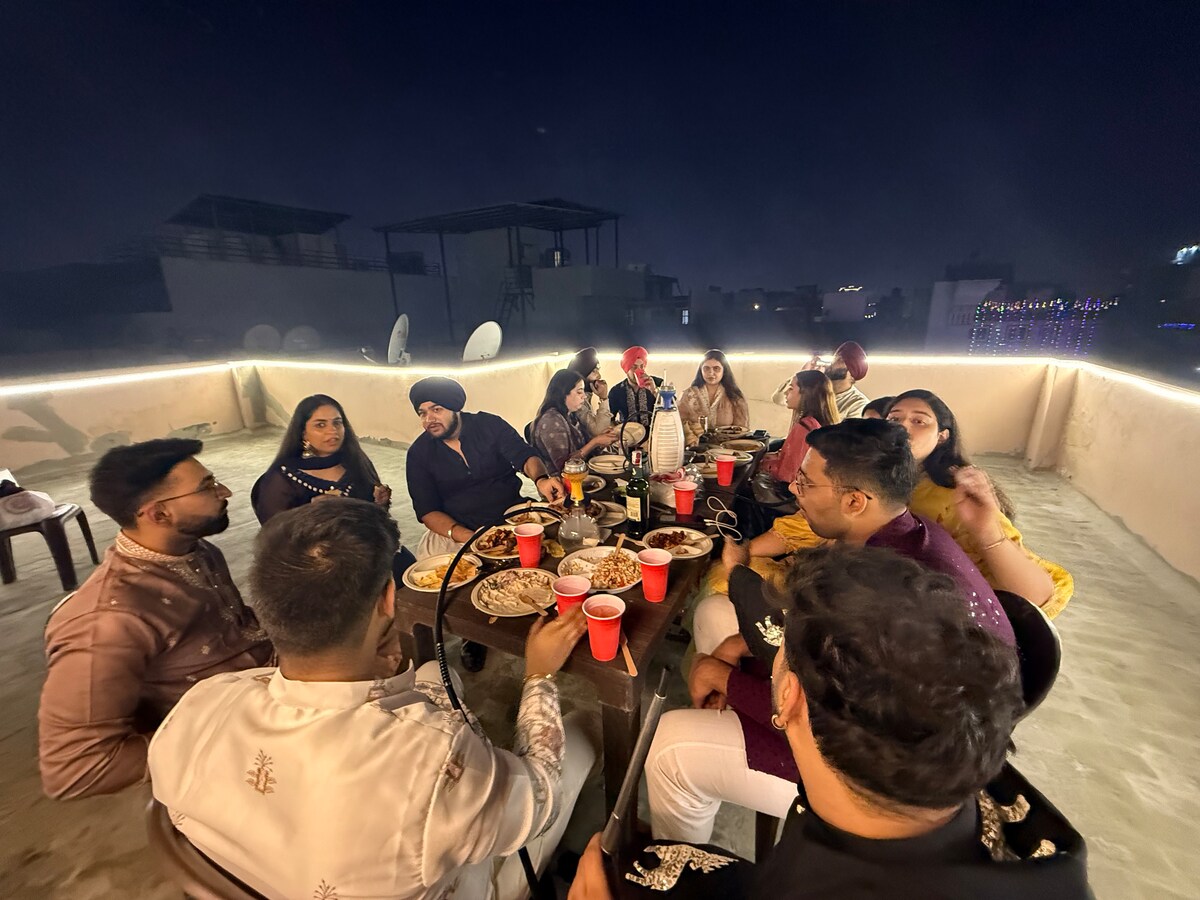 Namaste! Matatagpuan sa pangunahing lugar ng unibersidad sa North Delhi, nasa mga yapak mo lang ang mga sikat na panaderya at cafe. Pribadong palapag ito na may maliit na kusina, maliit na templo, at master bedroom na may halos 1000sq ft. May pribadong balkonahe at terrace. Nasa 3rd floor ito na walang elevator, ibinibigay ang tulong sa bagahe kapag nauna nang hiniling.