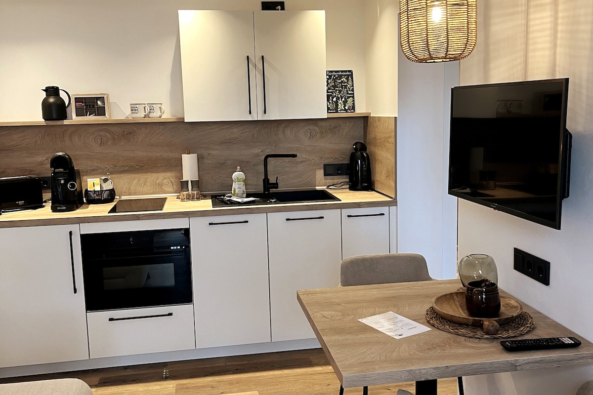Naghihintay sa iyo ang village square apartment sa aming holiday resort na "Das Wyzenborne". Tinatayang 30 sqm, walang hadlang at premium na kagamitan: Kuwarto na may box spring bed, built - in na ligtas. Maliit na komportableng lugar na nakaupo na may flat - screen TV at radyo, modernong kusina sa bansa na may dishwasher, banyo na may rain shower at hairdryer. Libreng Wi - Fi. Terrace sa harap ng apartment. Kasama ang mga serbisyo: Mga higaan na ginawa, pakete ng tuwalya, pakete ng kusina (sabon at label ng pinggan, mga tab, mga paper towel), almusal at hapunan (dagdag na bayarin)