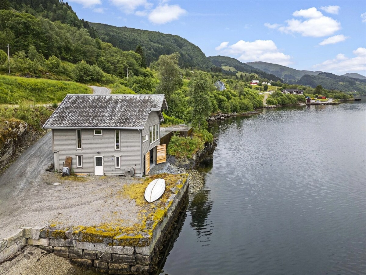 Maginhawang boathouse sa magandang tanawin at rural na setting na may fjord at bundok na nasa labas lang ng bintana ng iyong silid - tulugan. Ang boathouse ay matatagpuan mismo sa tubig. Sa unang palapag ay makikita mo ang isang silid para sa libangan, at ang ikalawang palapag ay binubuo ng isang pinalamutian na apartment na may mga modernong pamantayan. May beranda rin sa ikalawang palapag kung saan masisiyahan ka sa umaga habang hinihigop ang iyong kape. Maluwag ang pier at may magagandang oportunidad para sa pangingisda, sunbathing, swimming, at barbeque.