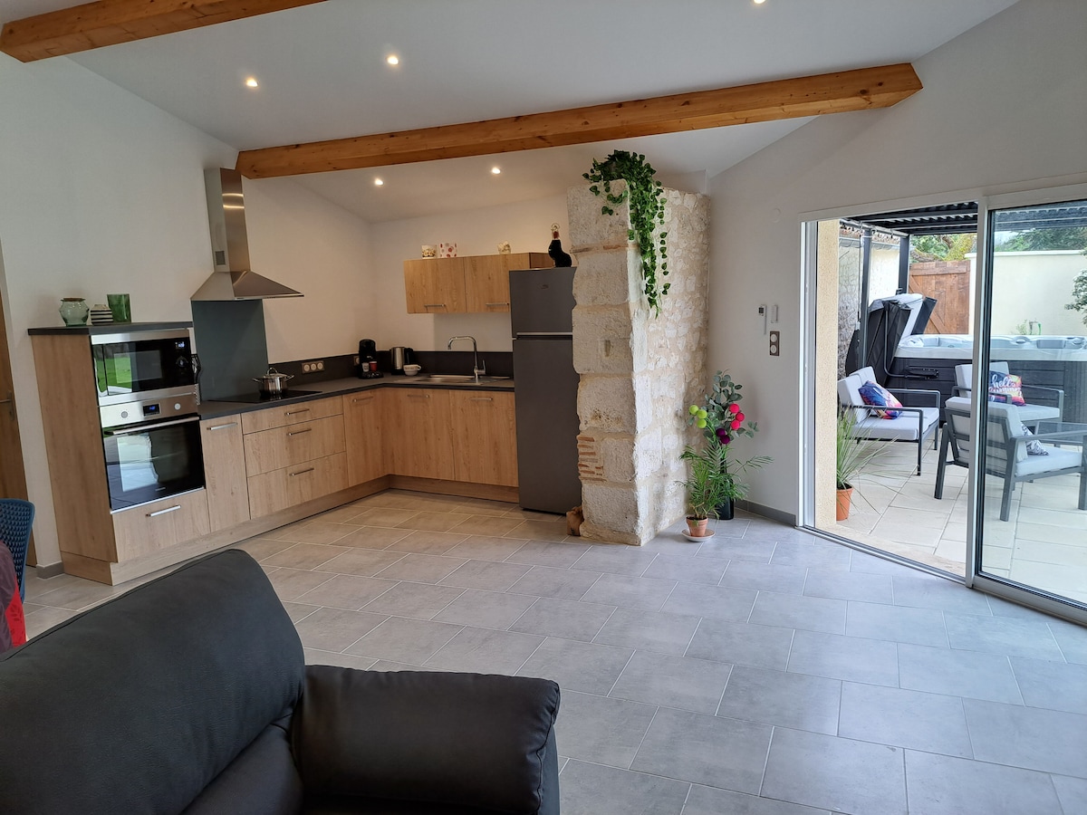 Enjoy a relaxing stay with a private spa in a peaceful and unspoiled natural setting at the gateway to the Périgord — perfect for a true break. Heated spa available all year round on a covered terrace with countryside views. Everything is ready on arrival: beds made, linens and bathrobes provided. 2 bedrooms, each with its own bathroom. Swimming pool (seasonal), pétanque court and surrounding nature. 1 hour from Bordeaux, close to castles, bastide villages and outdoor activities.