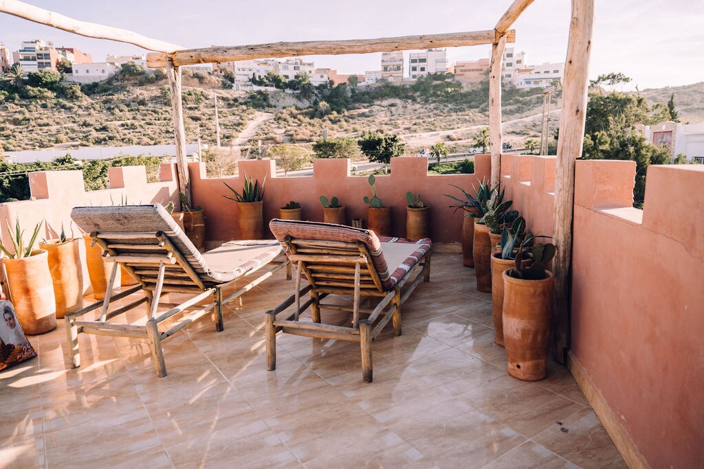 Modern flat with oceanview in the picturesque village of Tamraght. The flats are new, comfortable and clean. They have double beds and single beds (which can be made into a double bed), private bathrooms with towels. The flats are air-conditioned and equipped with a smart TV. The large roof terrace with its wooden pergola, Moroccan lounge and fantastic ocean view is one of the favourite spots in the house. Apartment is on the 1st floor and the beach is withing walking distance.
