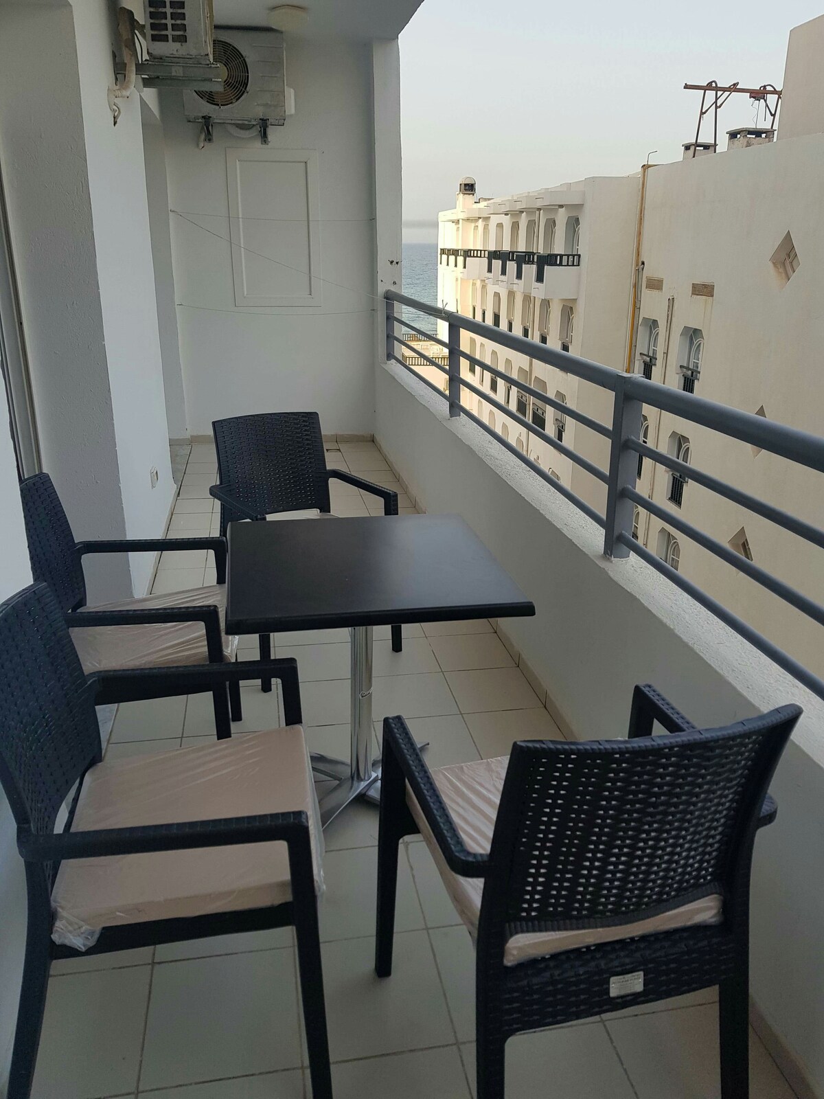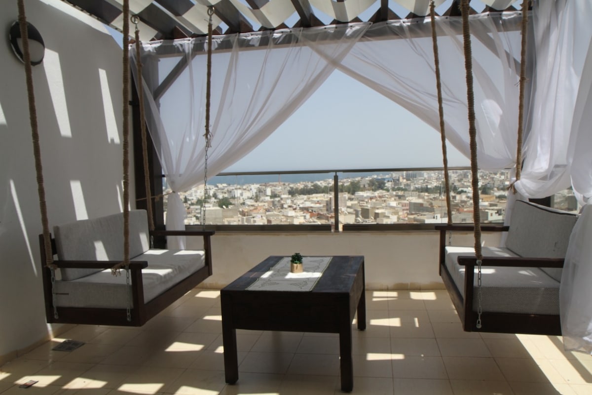 magandang apartment na may kumpletong kagamitan na 5 minutong lakad papunta sa beach. perpekto ang lokasyon sa pagitan ng lugar ng turista, beach at lumang bayan ( medina), malapit lang ang lahat, kabilang ang mga restawran, cafe, tindahan, supermarket, beach at souq matatagpuan ang apartment sa ika -4 na palapag ng moderno at ligtas na tirahan na may tanawin ng beach mula sa sala at mga kuwarto . Ligtas ang kapitbahayan para sa paglalakad sa gabi.