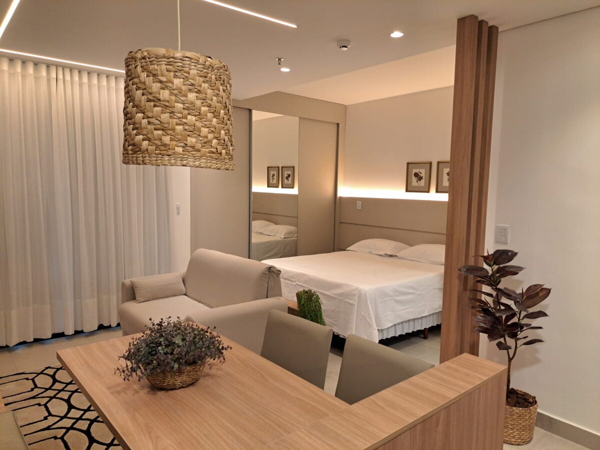 Você vai adorar! Apartamento mobiliado e muito bem equipado, com cama confortável, ar condicionado, sala com Smart TV e sofá cama, cozinha completa com refrigerador, freezer, microondas, fogãozinho elétrico e utensílios básicos. Banheiro amplo e com box. Varandinha privativa. Condomínio diferenciado com piscina e academia. Atendimento personalizado durante toda a estadia.