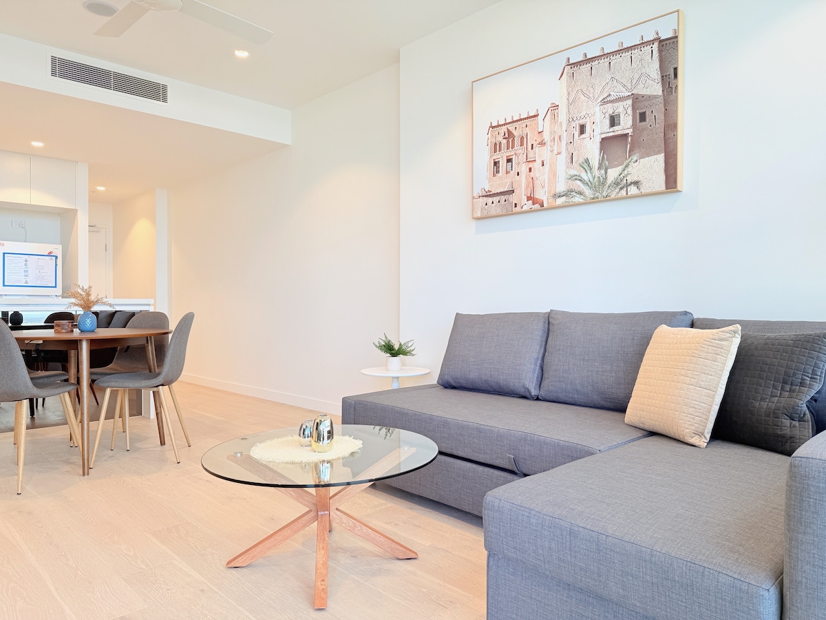 Matatagpuan ang naka - istilong apartment na ito sa loob ng presinto ng Queens Wharf sa tabi ng Star Casino ng Brisbane na nag - aalok ng mga nakamamanghang tanawin ng ilog at lungsod sa pamamagitan ng mga bintanang mula sahig hanggang kisame, komportableng open - plan na sala na may mga eleganteng muwebles, tahimik na kuwarto na may mainit na tono, at pribadong balkonahe na perpekto para sa pagrerelaks😴. Ang pangunahing lokasyon nito ay naglalagay sa iyo ng mga hakbang mula sa world - class na kainan, libangan, at magagandang paglalakad sa tabing - ilog - kaginhawaan, luho, at kaginhawaan sa isang perpektong urban retreat✨.