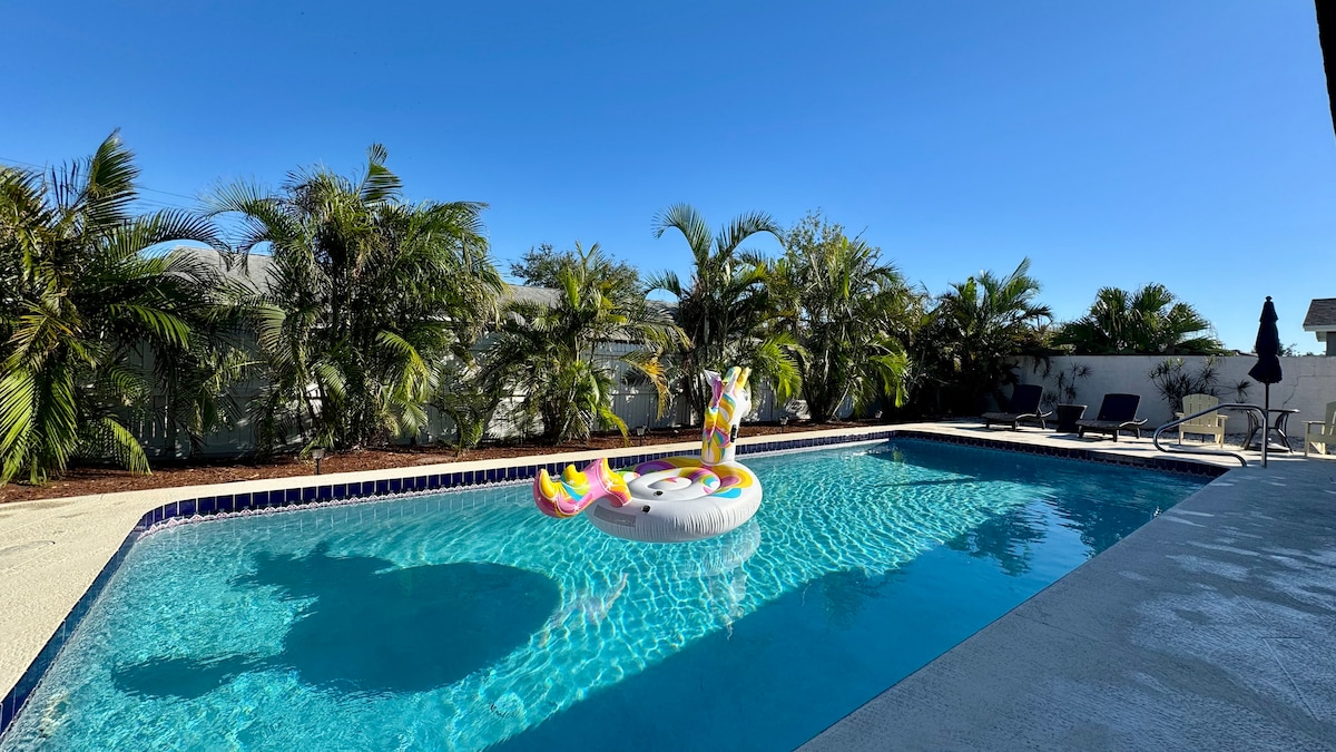 Welcome sa pribadong pool oasis mo sa Bradenton! . Ang pinapainit na pool house na ito ay nasa magandang lokasyon at napapanatili nang mabuti sa isang cul-de-sac at nasa sentro ng beach (15 minutong biyahe papunta sa Anna Maria Island), IMG Academy, The Bradenton Country Club, sikat na Riverwalk, downtown, at maraming restawran at opsyon sa pamimili. Masiyahan sa iyong sariling pribadong oasis na may maraming espasyo para sa iyong pamilya at mga kaibigan na may 3 silid - tulugan na maaaring matulog ng 8 bisita at isang ikaapat na bonus na kuwarto na maaaring matulog ng 2 karagdagang bisita