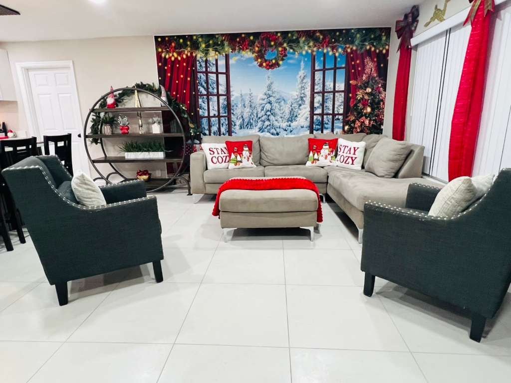 Newly renovated and located in a prime location. This is a great spot for your vacation. We are only a 10 min drive to the Beach and less than 15 min to international speedway. This house has an Open kitchen with stainless steel appliances and all the essentials! There is a fire pit in the backyard that leads out to a swing set, cornholes, and a screened in Heated pool with fun floats. The patio has a Monument propane grill, where you can BBQ and lounge under our pergola making fun memories.