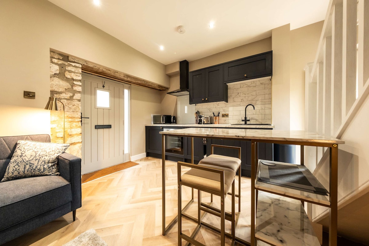 Magandang kamalig na na - convert sa isang mataas na kalidad na matatag na flat na ipinagmamalaki ang mga orihinal na beam at tampok, natutulog 1 o 2 tao - nakakalungkot na walang mga bata o alagang hayop. Pribadong bulwagan ng pasukan, perpekto para sa pag - iimbak ng mga coats at bota pagkatapos ng isang araw na pagtuklas sa aming nakamamanghang kanayunan. Sa itaas ay magaan at maaliwalas na may matataas na kisame at maraming bintana. Mga makapigil - hiningang tanawin mula sa patag kung saan matatanaw ang mga kable. Komportableng king sized bed, na may en - suite shower room. Ganap na functional na kusina/dining area na may bukas na plano sa sala.