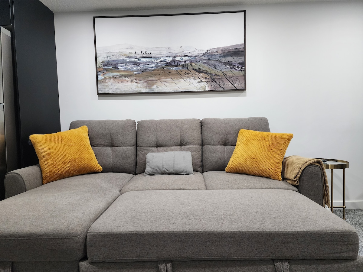 Maligayang pagdating! Perpekto ang modernong tuluyan na ito para sa mga mag - asawa, solo adventurer, at business traveler. Matatagpuan sa timog - silangan, nagtatampok ang apartment ng sala na may sofa bed at Smart TV, na may kumpletong kusina. Nilagyan ang silid - tulugan ng queen - sized na higaan. Makinis ang banyo at may rainfall shower. Ito ay isang soundproofed basement suite ngunit maaari mo pa ring marinig ang ilang ingay. Layunin naming gawing komportable ang iyong pamamalagi, kaya ipaalam sa amin kung mayroon kang anumang kahilingan.