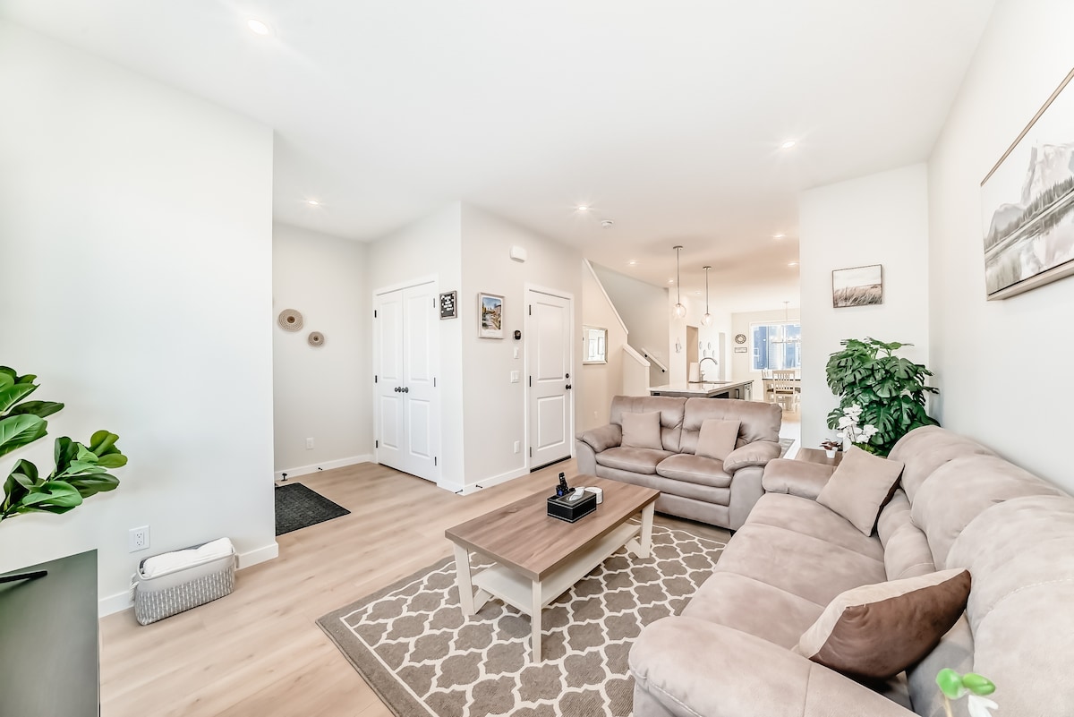This gorgeous gem nestled in the heart of Calgary's premiere resort Community: Mahogany! Direct access to bus routes! Light & Bright, work from home in cozy work from home office. Well-equipped home has 2 family rooms with separate TVs, 4 bedrooms with super comfy memory foam mattresses and big beautiful windows. Close to Chairman's SteakHouse and Analog Coffee! Take a walk to see the splendor of the Mahogany Wetlands or head to the waterpark at the world's largest YMCA only a few minutes away!