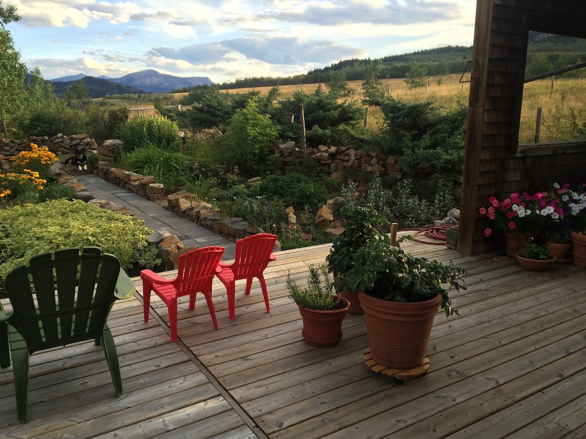 Magpakasaya sa katahimikan. Ilang minuto ang biyahe sa timog ng bayan pero nakakaramdam ka pa rin ng malayo sa kaguluhan ng buhay. Nakaupo sa 4 na ektarya, ang buong suite ay nakaharap sa kanluran na may mga walang tigil na tanawin ng lambak sa ibaba at papunta sa marilag na Rocky Mountains. Masiyahan sa takip na patyo at propane fire pit na may mga upuan sa labas. Perpekto ang suite na ito para sa mag - asawang naghahanap ng tahimik na bakasyunan o base para tuklasin ang nakapalibot na lugar. *TANDAAN* Pana - panahong available lang ang hot tub (Setyembre - Mayo)