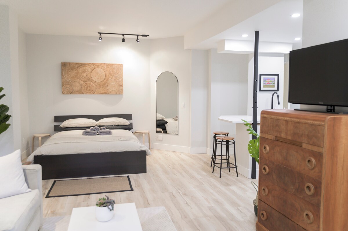 Masiyahan sa pribadong hiwalay na pasukan sa malinis at maayos na mas mababang antas na suite ng isang silid - tulugan na ito. Kumpletong kusina, in - suite na labahan, pribadong paradahan at espasyo sa labas. Mainam para sa mas matatagal na pamamalagi, perpekto para sa isa o mag - asawa. Kumpletong kusina→ na may dishwasher, kalan, microwave, atbp. → Maaliwalas na silid - tulugan na may Serta queen mattress → Gas fireplace, bukas na konsepto ng pamumuhay, TV → Lugar ng trabaho + wi - fi → Maluwang na 4pc na banyo → Paglalaba Paradahan → sa labas ng kalye Ang legal na pangalawang suite ay may nakatalagang init/bentilasyon.