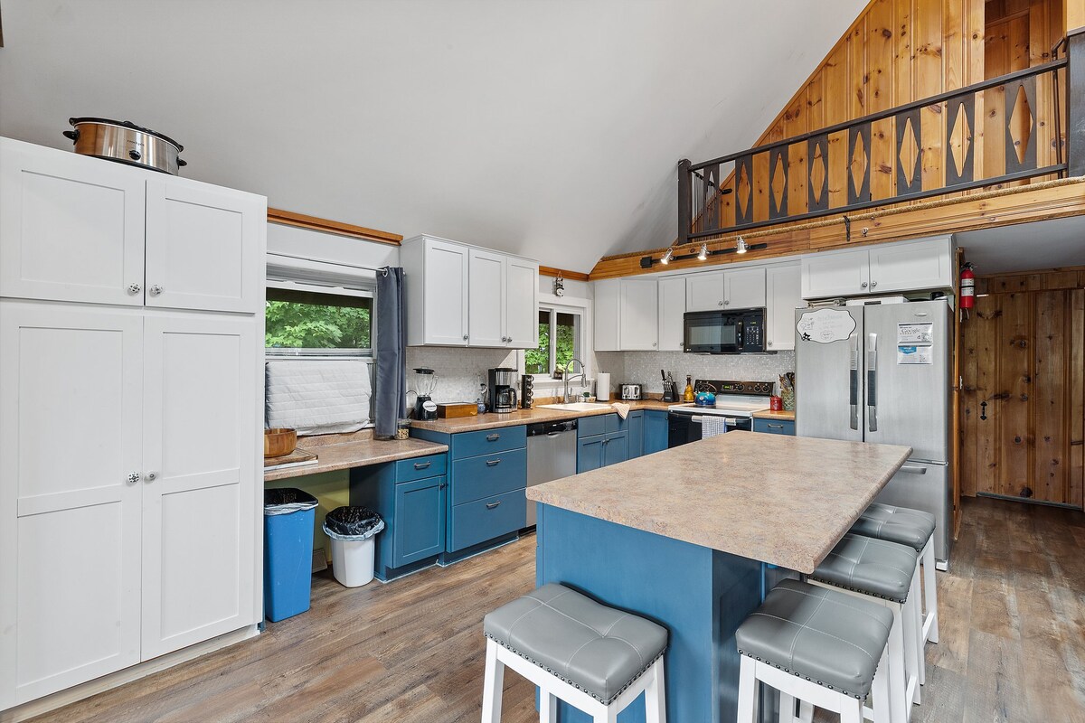 Nagtatampok ang bakasyunang ito ng dalawang maluluwag na silid - tulugan at loft sa itaas na silid - tulugan, na natutulog nang hanggang 6 na oras. Ang malaking banyo ay naa - access ng parehong master bedroom at living room at nagtatampok ng on - site laundry. Para sa mga bisitang mahilig magluto, kumpleto sa gamit ang kusina at perpektong lugar ang deck para magrelaks sa tag - araw at mag - enjoy sa tanawin. Sa mas malamig na panahon, hinihikayat ang mga bisita na maging komportable sa pamamagitan ng wood - burning stove o gamitin ang outdoor BARREL SAUNA.