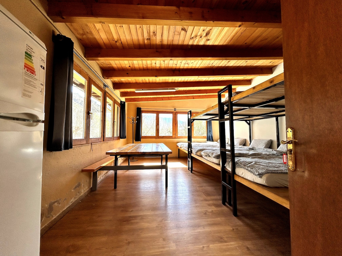 ¡Descubre nuestro refugio de montaña en Sort, dentro del Camping Noguera Pallaresa! Único por su ubicación frente al río y la calidez de su gente. Disfruta de una estancia acogedora en una habitación para un máximo de 10 personas. Camas tipo litera, almohada y sábana bajera incluidas. Debes traer tu saco de dormir/mantas y toallas. Equipada con una amplia mesa para comer con vistas a la montaña, microondas y nevera en la habitación. ¡Reserva ahora y vive una aventura en los Pirineos!