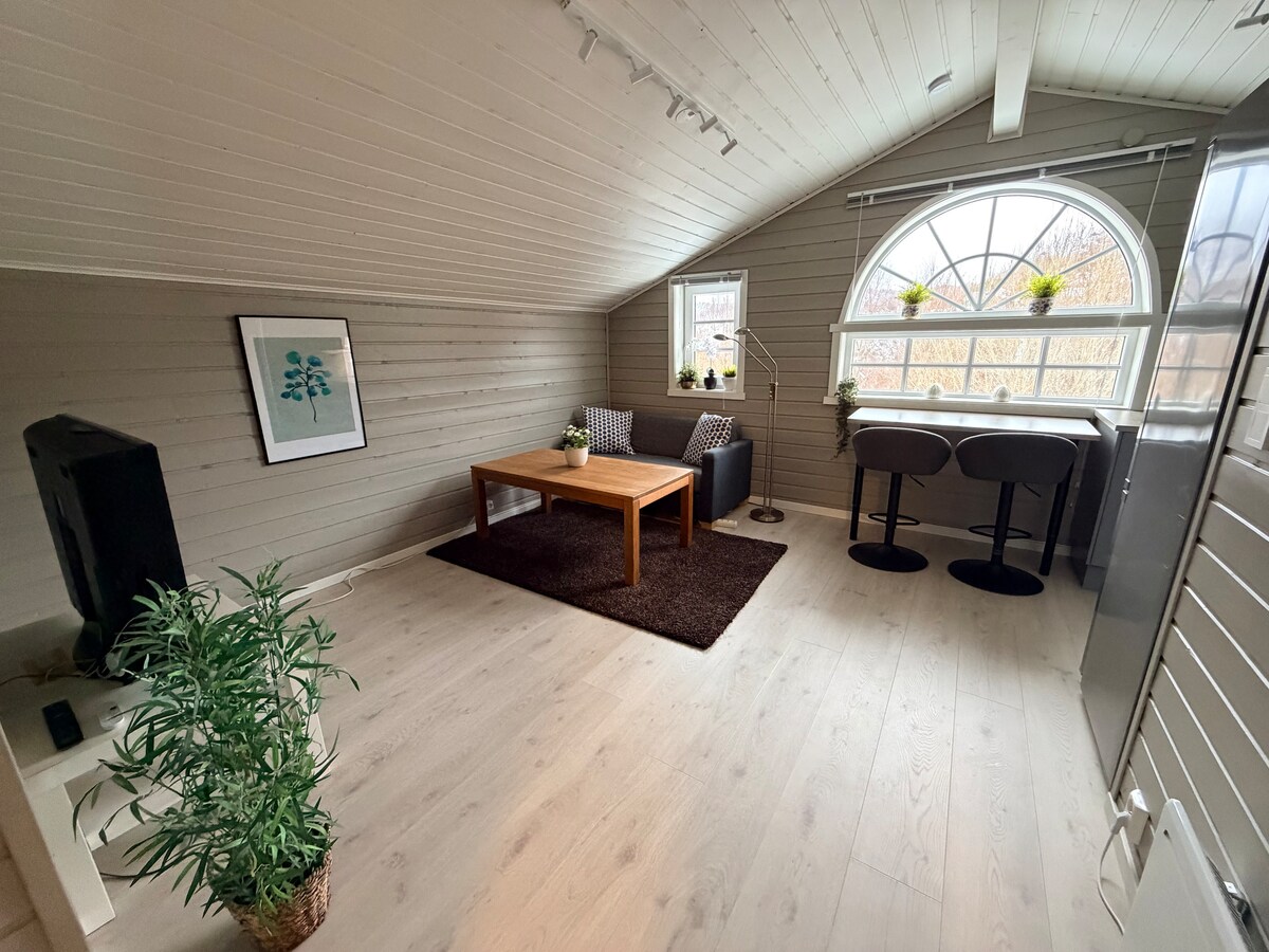 Mini - house sa tahimik na lugar na malapit sa "lahat"; sentro ng lungsod, tindahan, kagubatan, beach at mga aktibidad (swimming pool, stadium, tennis, frisbee golf, volleyball, mini golf). Half - hour drive mula sa Kristiansand. Libreng paradahan sa labas. Pergola at patyo. 1 kuwartong may maliit na kusina (hot plate/oven, kettle, Moccamaster, toaster, refrigerator) at dalawang higaan. Posibilidad ng kutson sa sahig. Available ang bed linen at mga tuwalya. Paghiwalayin ang banyo na may shower. WiFi at TV w/Chromecast + Apple TV (Netflix, Viaplay, Disney+, Max)
