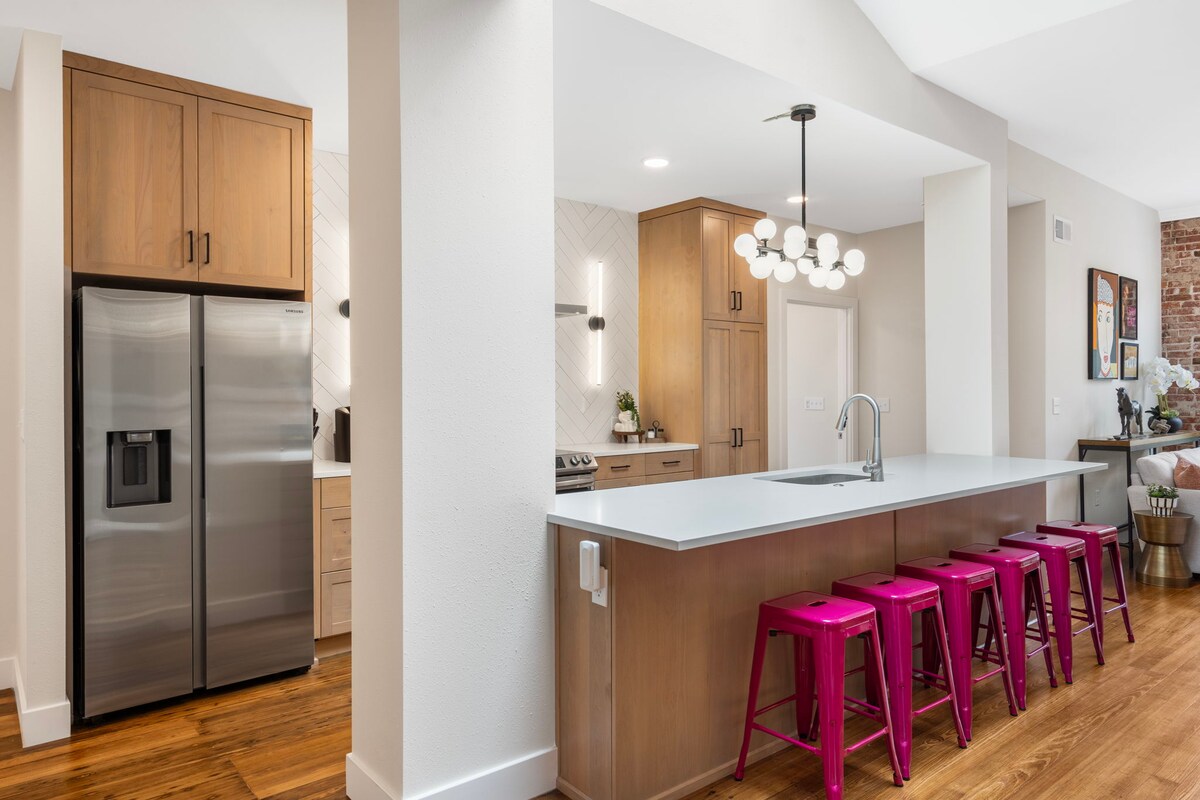 Maligayang pagdating sa iyong pangarap na bakasyon! Pinagsasama ng kamangha - manghang bagong modernong loft na ito ang kontemporaryong disenyo na may komportableng kaginhawaan. Matatagpuan sa masiglang kapitbahayan, nag - aalok ito ng hindi malilimutang karanasan. Masiyahan sa isang open - concept na sala na may malalaking bintana, nakalantad na brick, mataas na kisame, kumpletong kusina, mga naka - istilong silid - tulugan, mararangyang paliguan, at mga pinapangasiwaang elemento ng disenyo sa iba 't ibang panig ng mundo. Perpekto para sa pagrerelaks o paglilibang - naghihintay ang iyong perpektong bakasyunan!