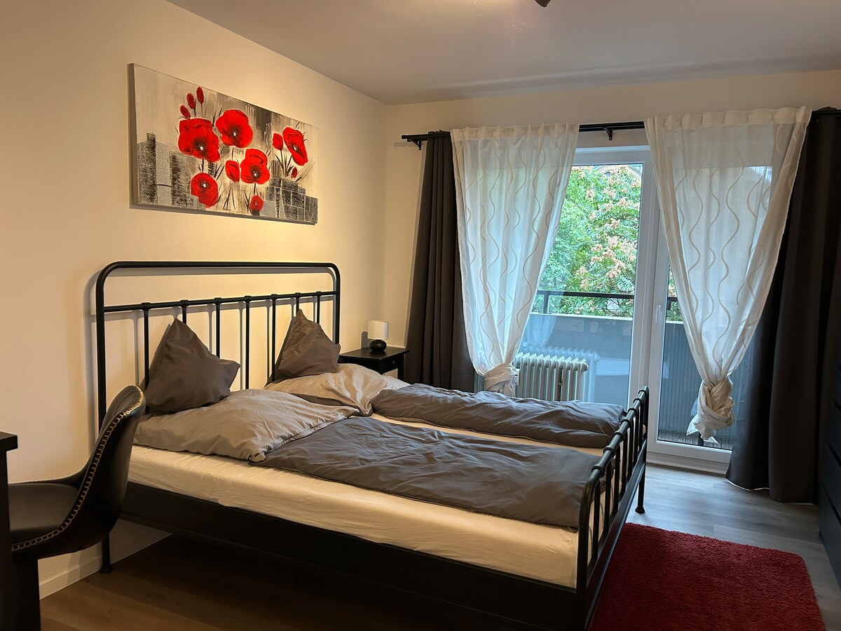 Loated sa isang tahimik na lugar sa tabi ng downtown Düsseldorf, ang Rhein at Oldtown ay magagamit sa pamamagitan ng paglalakad o pampublikong transportasyon sa ilalim ng 10 minutong pagsisikap. 4 na istasyon ng subway ang layo ng Central Station. Nag - aalok din ang 2 - bedroom flat (3 kuwarto at kusina at banyo) ng banyo at sala.