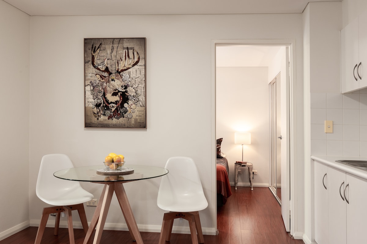 Naka - istilong at tahimik na self - contained studio malapit sa pinakasikat na kalye sa Sydney na may maraming cafe, restawran, bar at tindahan. May itinalagang paradahan ng kotse Sa isang madahon at tahimik na kalye na napapalibutan ng mga kaakit - akit na terrace, hindi ka maniniwala na 5 minuto lamang ang layo ay King St kung saan nangyayari ang lahat ng aksyon. Malapit ito sa 3 istasyon ng tren sa loob ng 8 minutong lakad. Ang pinakamalapit na isa ay 3 minuto lamang ang layo. 5 minutong biyahe lang sa tren papunta sa Lungsod Maraming mga link ng bus pati na rin kabilang ang sa Coogee beach.